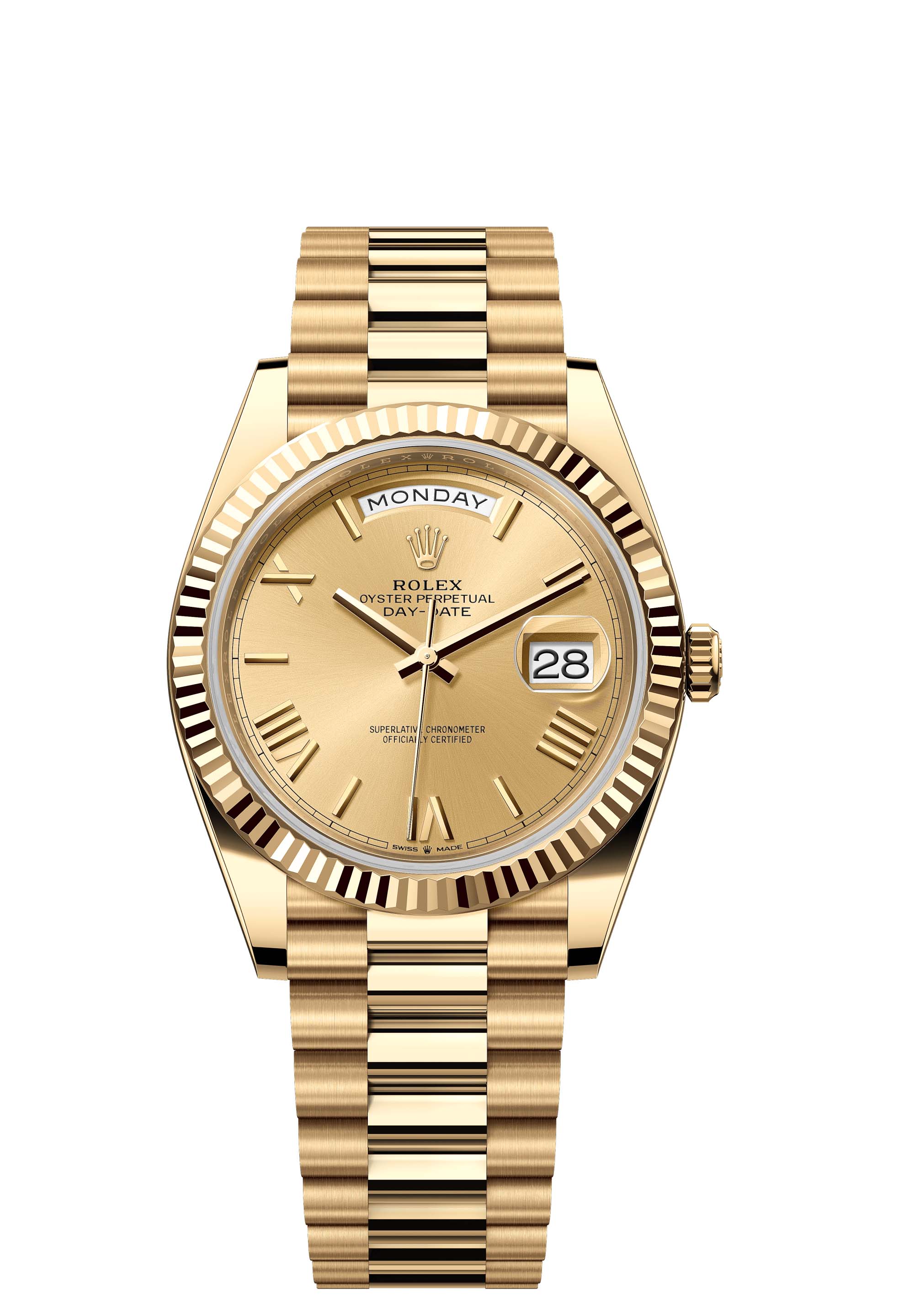 The Oyster Perpetual Day-Date 40 in 18 ct yellow gold with a champagne-colour dial, fluted bezel and a President bracelet.