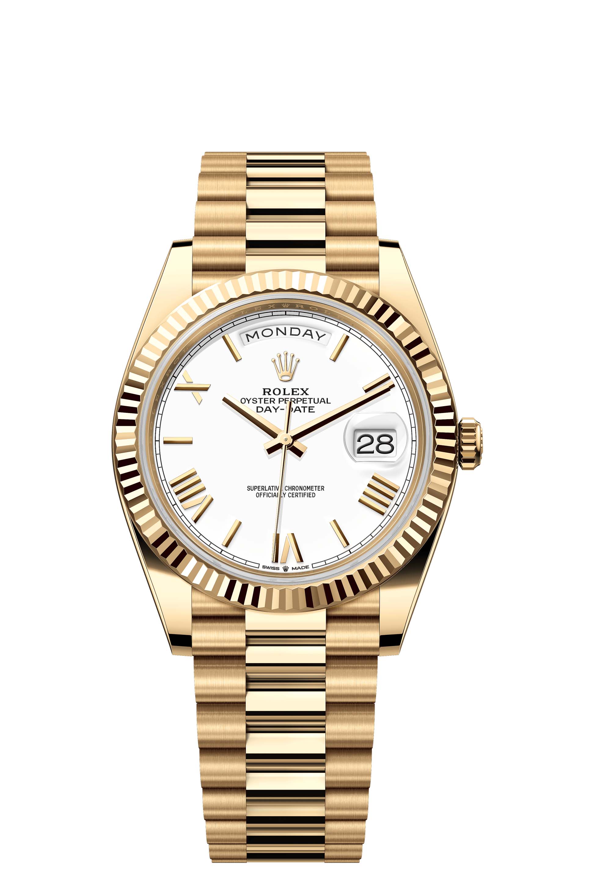 The Oyster Perpetual Day-Date 40 in 18 ct yellow gold with a white dial, fluted bezel and a President bracelet.
