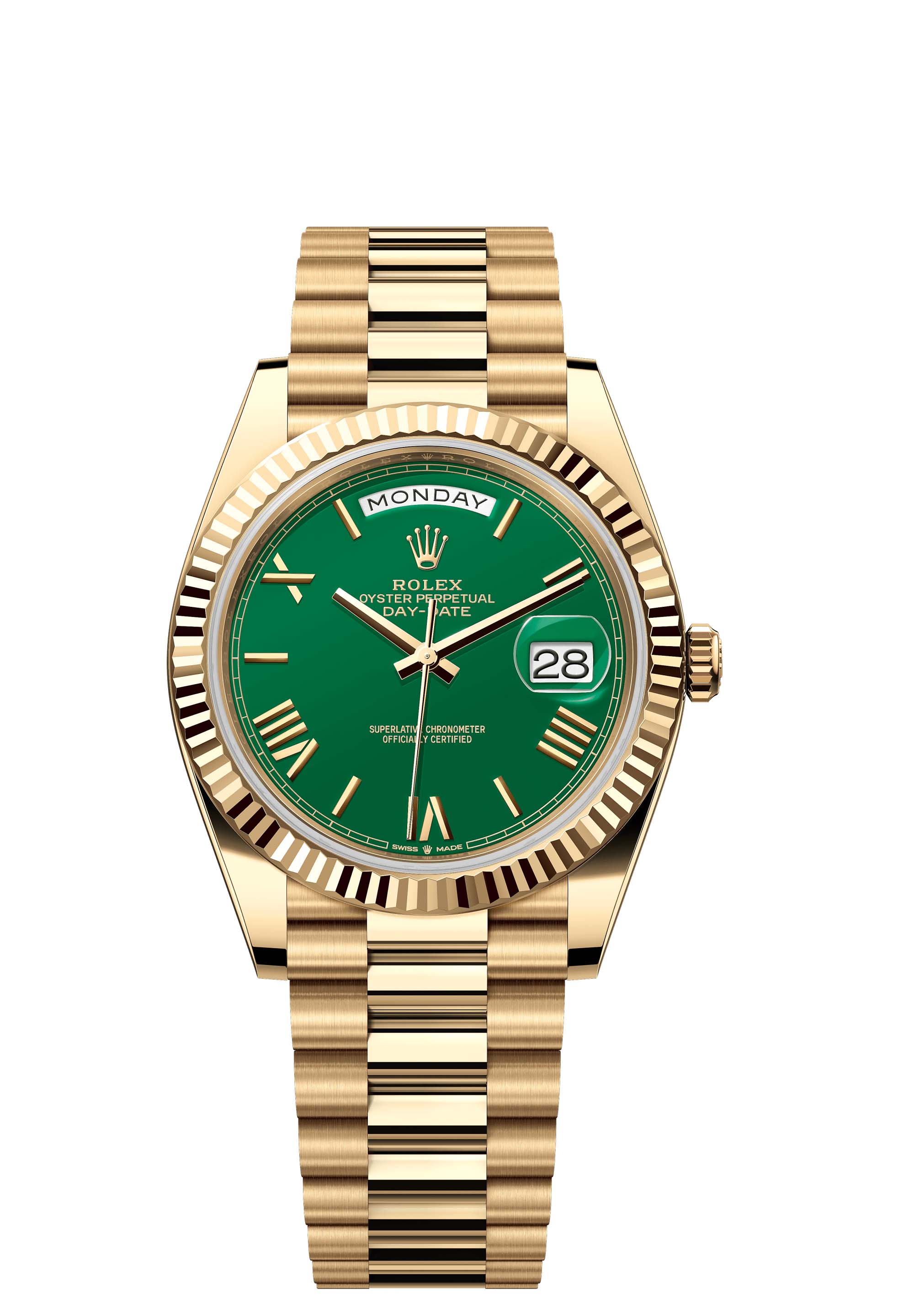 The Oyster Perpetual Day-Date 40 in 18 ct yellow gold with a green dial, fluted bezel and a President bracelet.