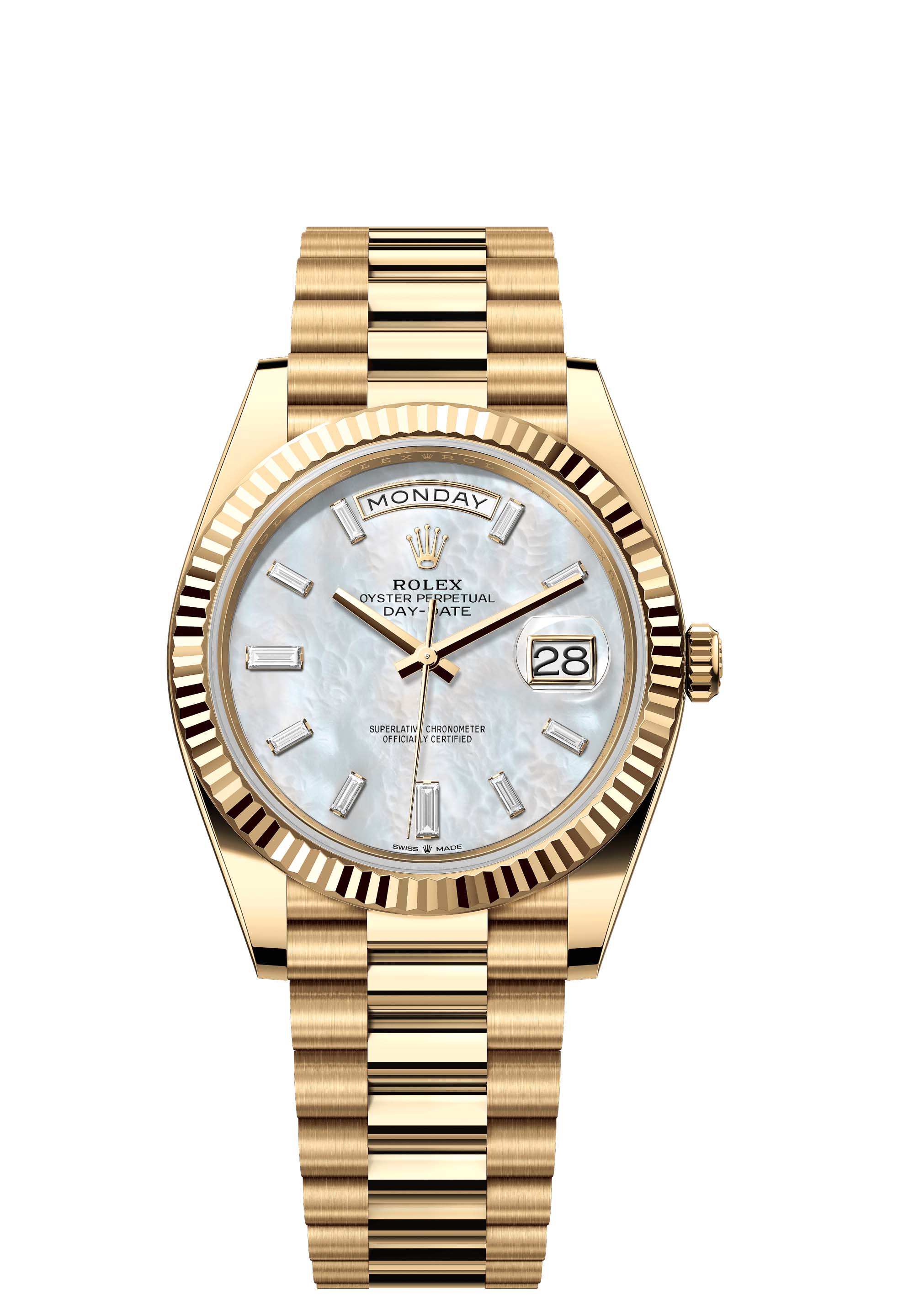 The Oyster Perpetual Day-Date 40 in 18 ct yellow gold with a white mother-of-pearl, diamond-set dial, fluted bezel and a President bracelet.