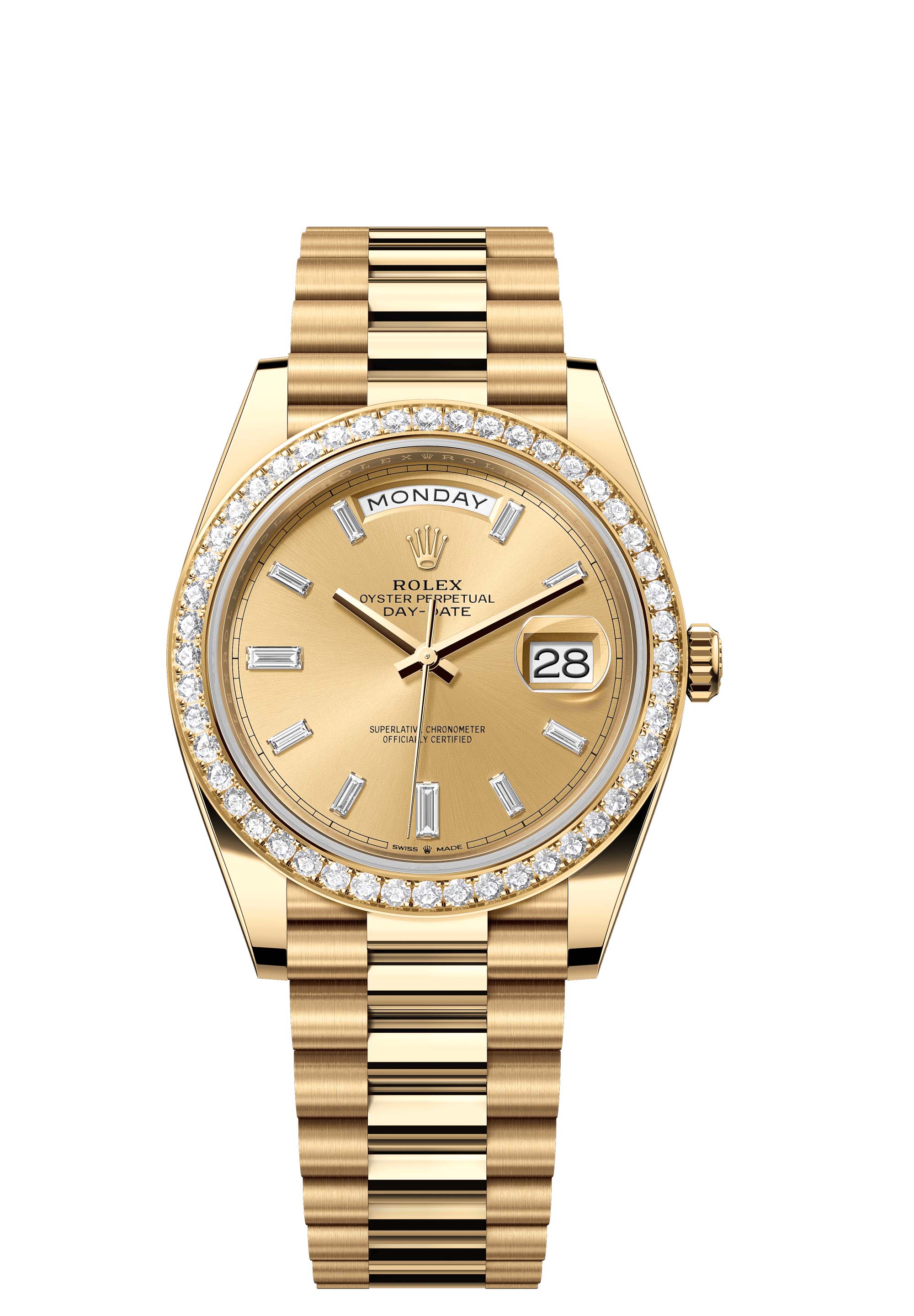 The Oyster Perpetual Day-Date 40 in 18 ct yellow gold, with a champagne colour, diamond-set dial, diamond-set bezel and a President bracelet.
