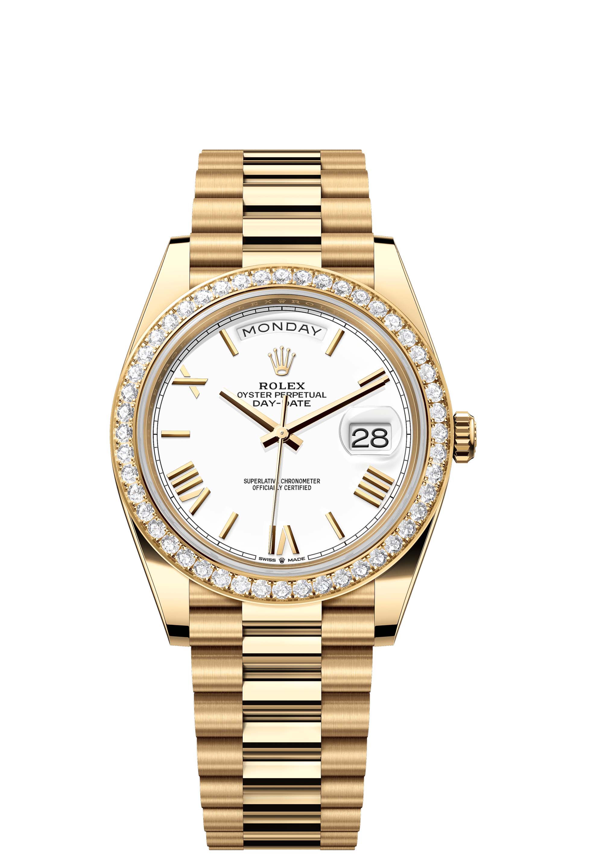 The Oyster Perpetual Day-Date 40 in 18 ct yellow gold with a white dial, diamond-set bezel and a President bracelet.