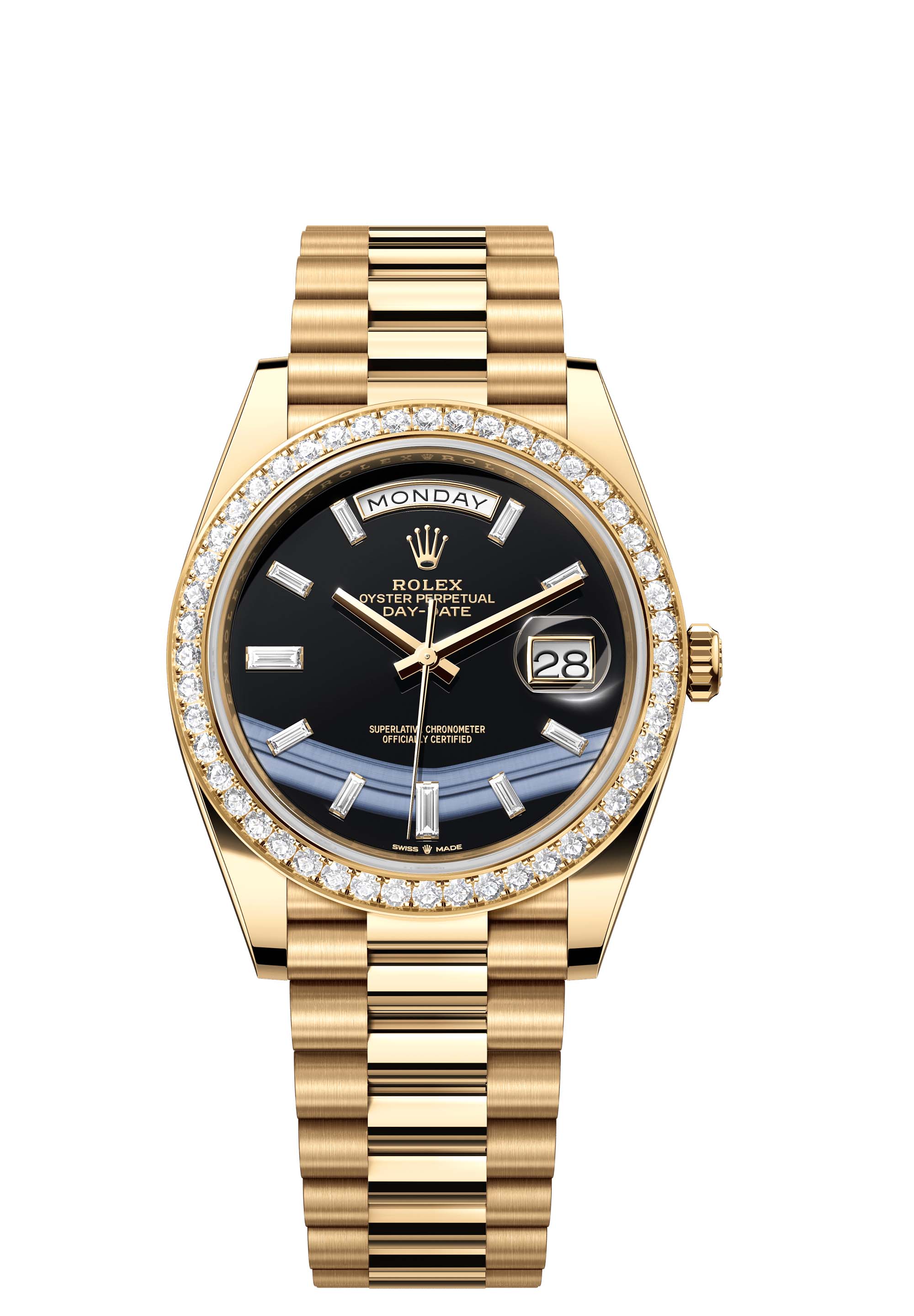 The Oyster Perpetual Day-Date 40 in 18 ct yellow gold, with an onyx, diamond-set dial, diamond-set bezel and a President bracelet.