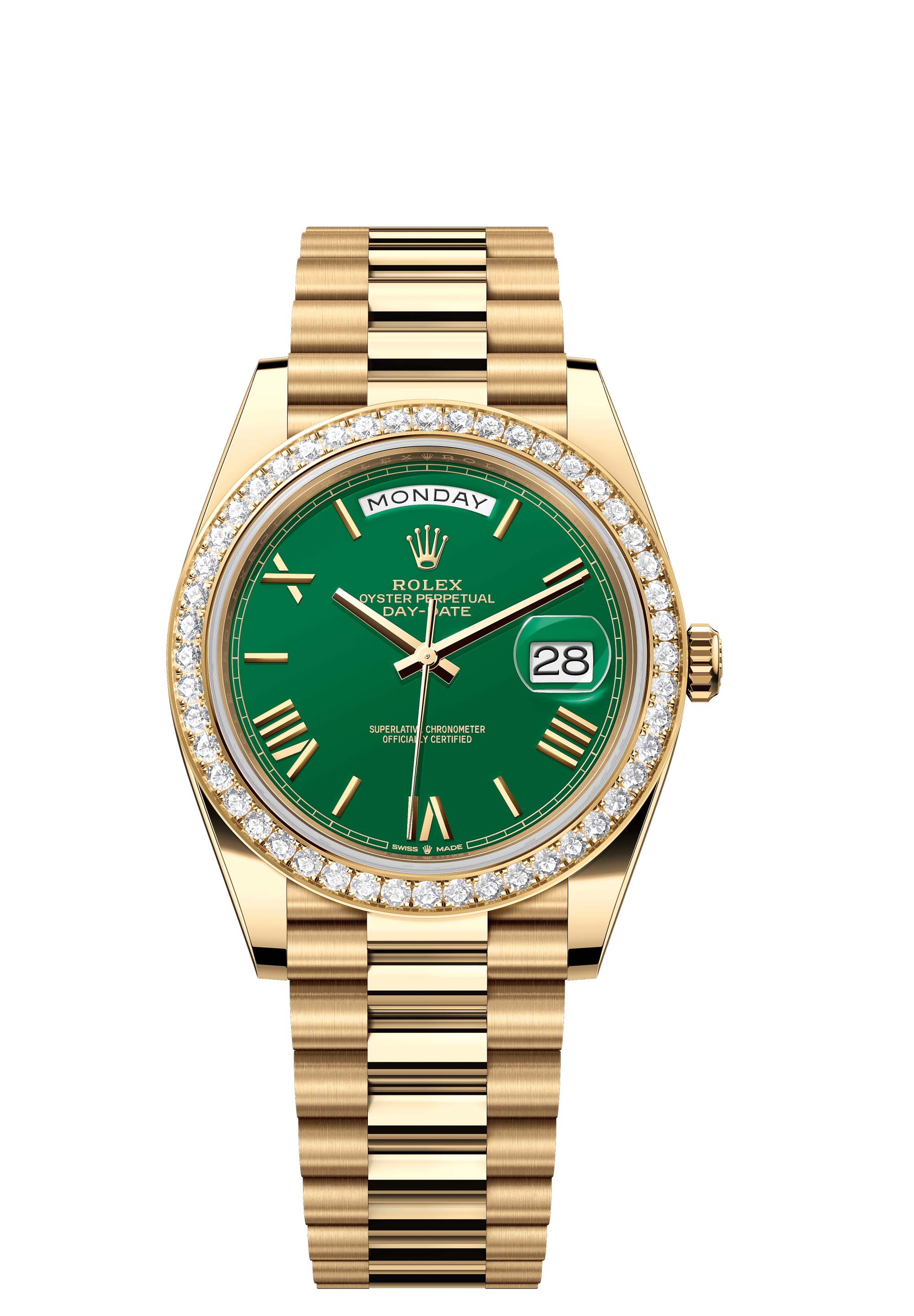 The Oyster Perpetual Day-Date 40 in 18 ct yellow gold with a green dial, diamond-set bezel and a President bracelet.
