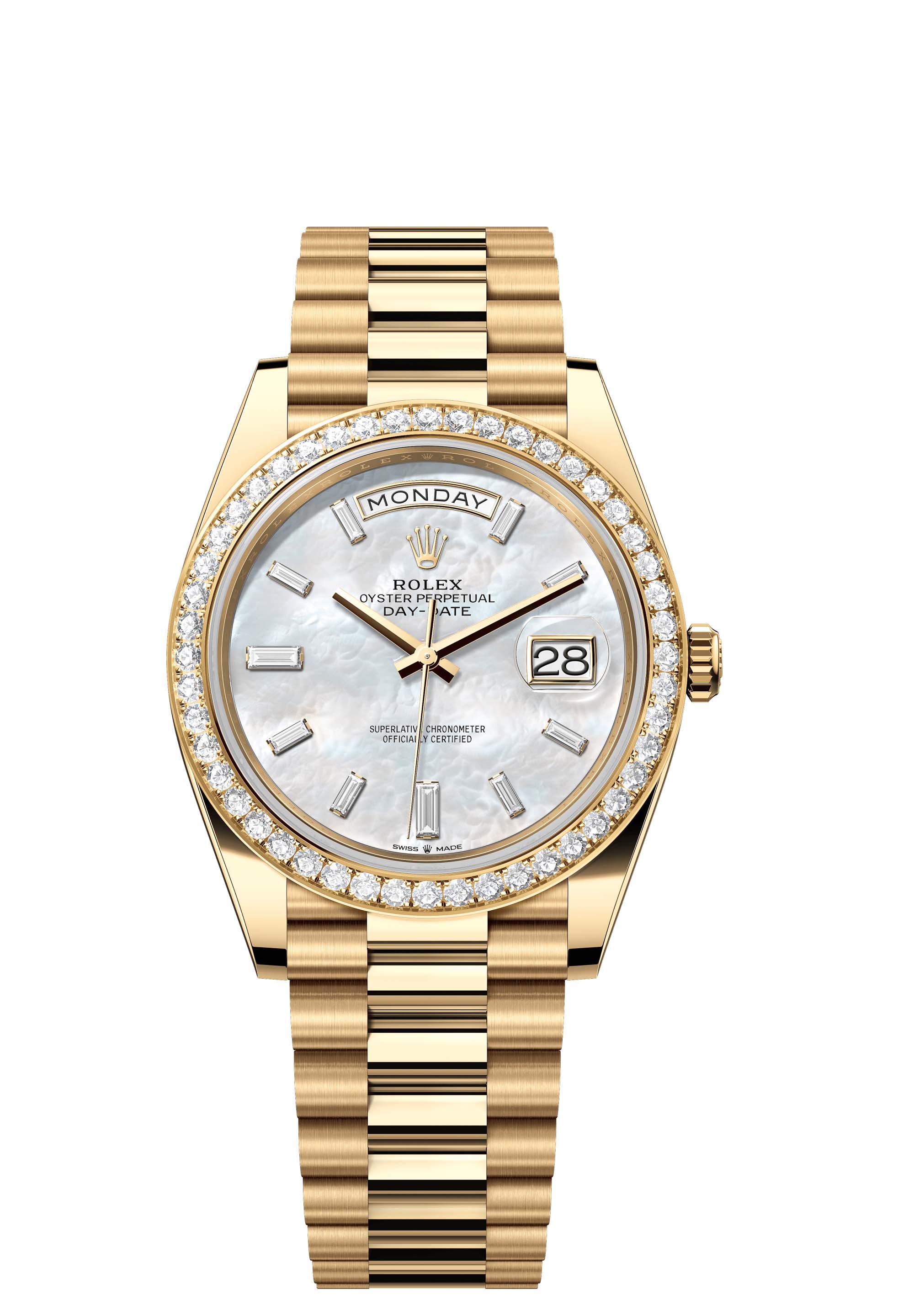 The Oyster Perpetual Day-Date 40 in 18 ct yellow gold, with a white mother-of-pearl, diamond-set dial, diamond-set bezel and a President bracelet.