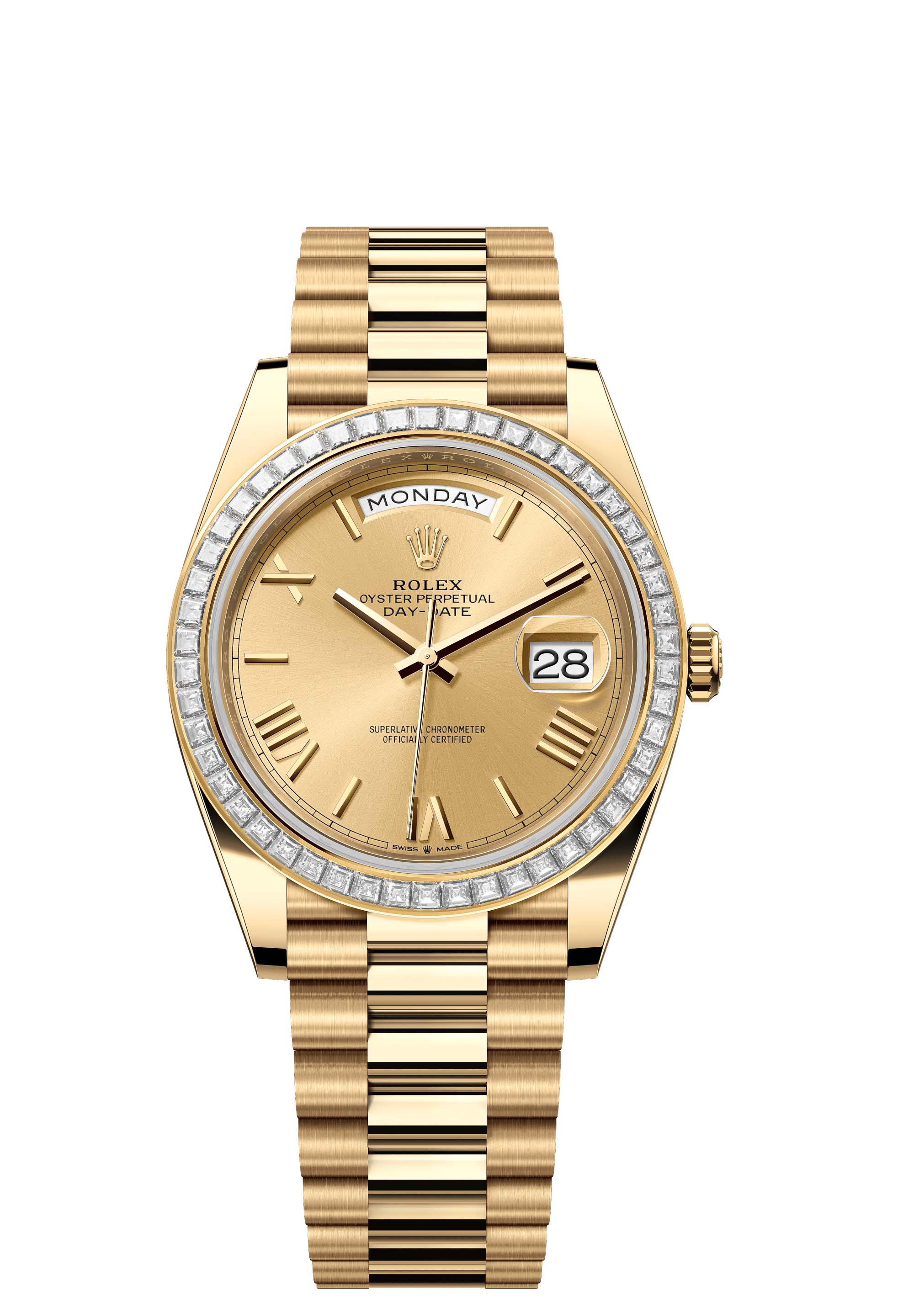 The Oyster Perpetual Day-Date 40 in 18 ct yellow gold with a champagne-colour dial, diamond-set bezel and a President bracelet.