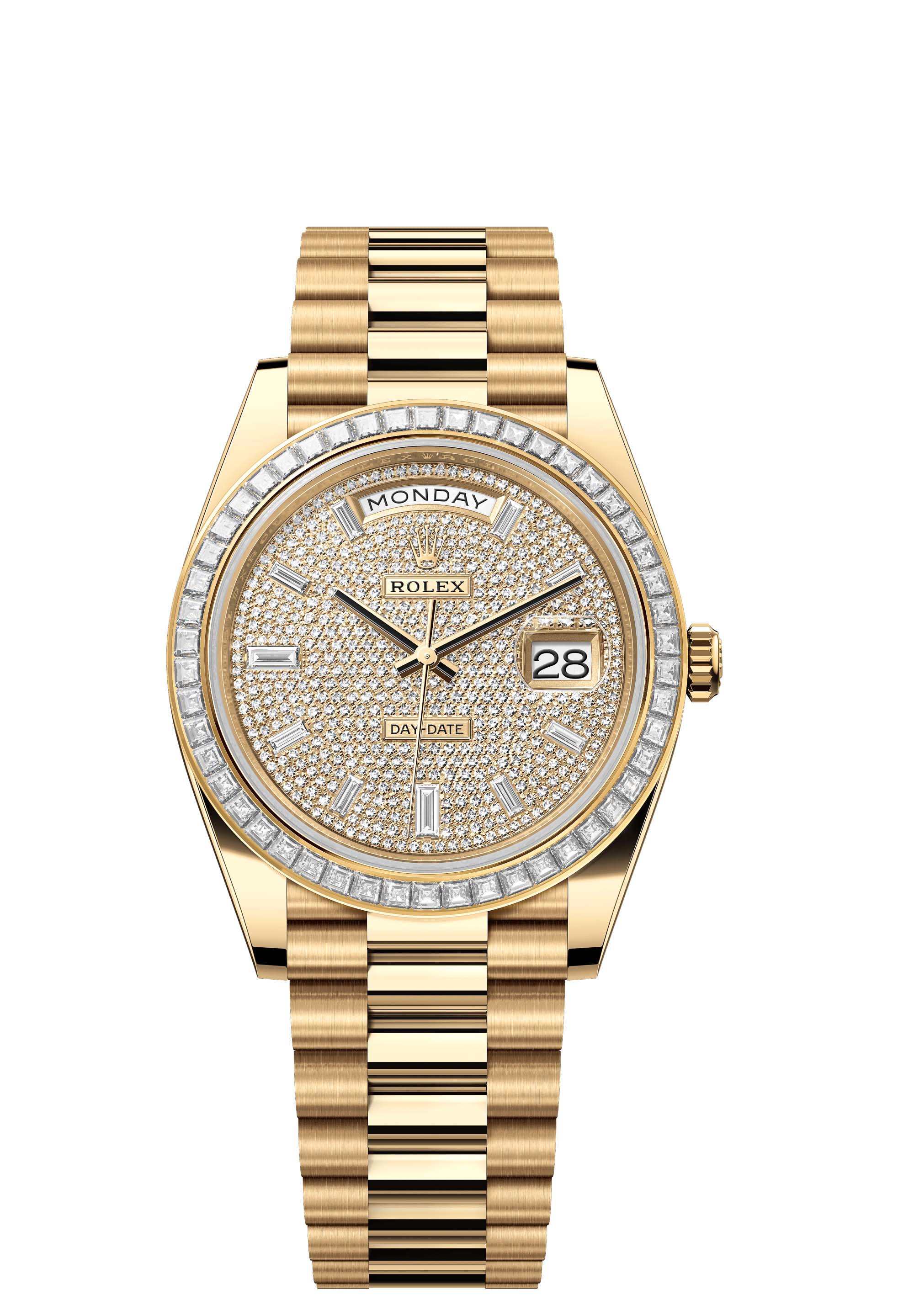 The Oyster Perpetual Day-Date 40 in 18 ct yellow gold, with a diamond-paved dial, diamond-set bezel and a President bracelet.