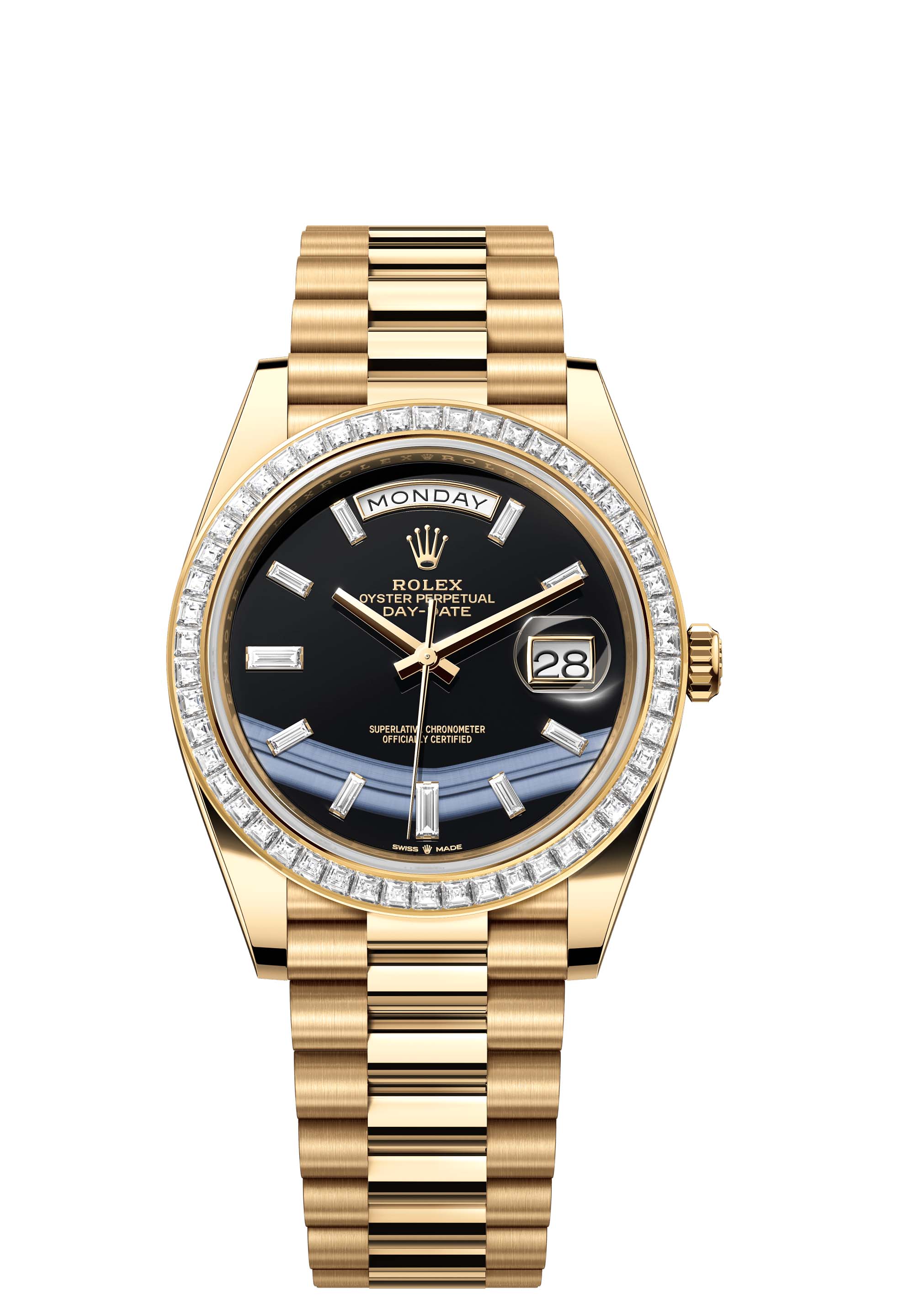The Oyster Perpetual Day-Date 40 in 18 ct yellow gold, with an onyx, diamond-set dial, diamond-set bezel and a President bracelet.