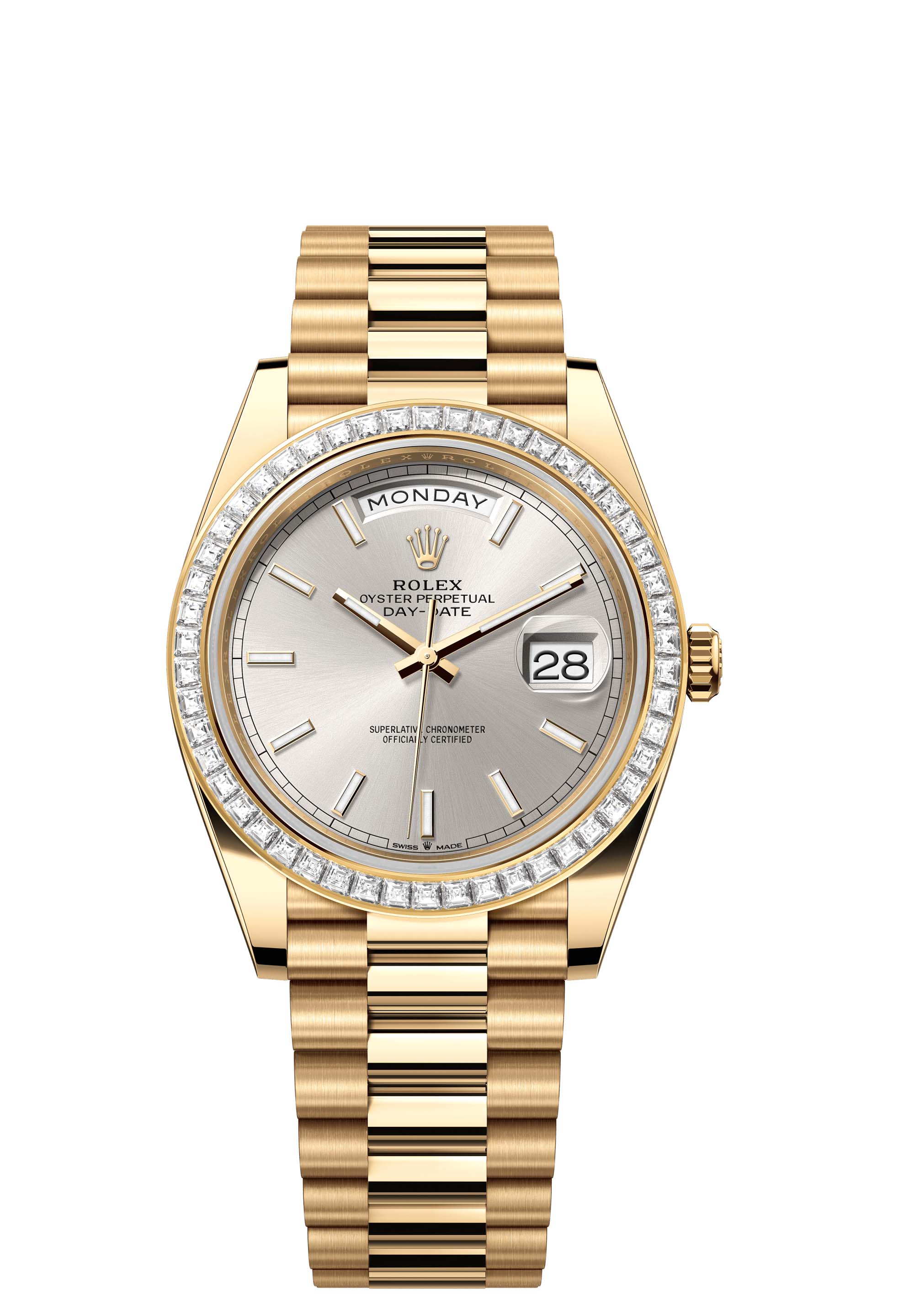 The Oyster Perpetual Day-Date 40 in 18 ct yellow gold with a silver dial, diamond-set bezel and a President bracelet.