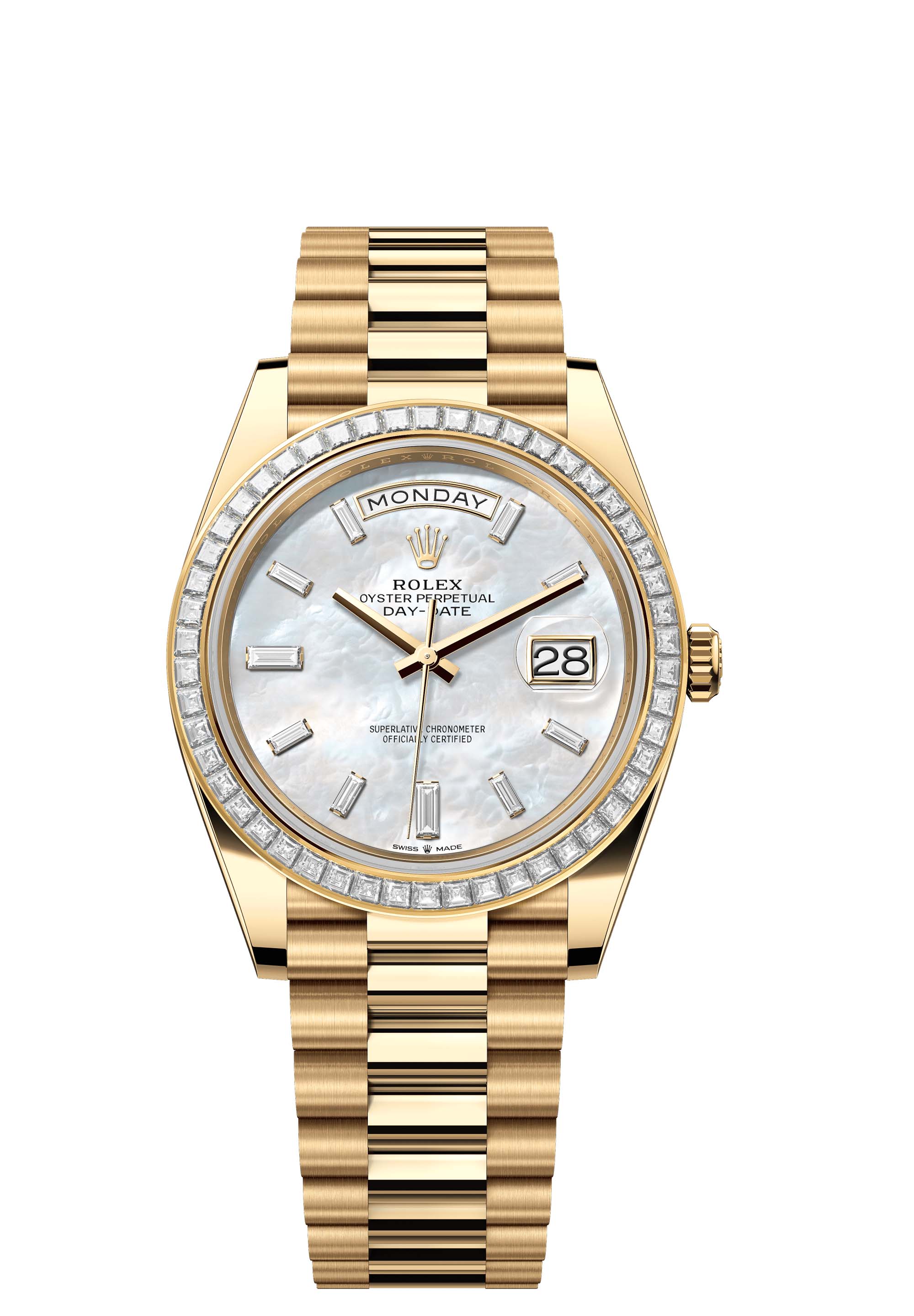 The Oyster Perpetual Day-Date 40 in 18 ct yellow gold, with a white mother-of-pearl, diamond-set dial, diamond-set bezel and a President bracelet.