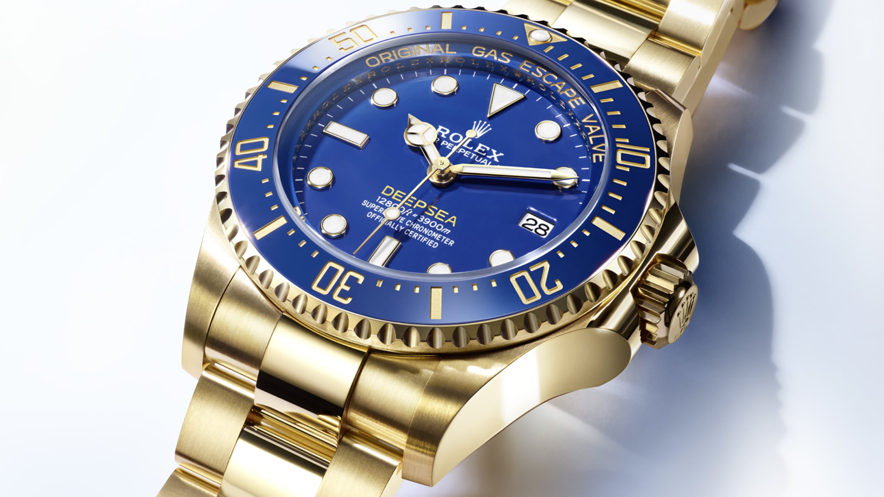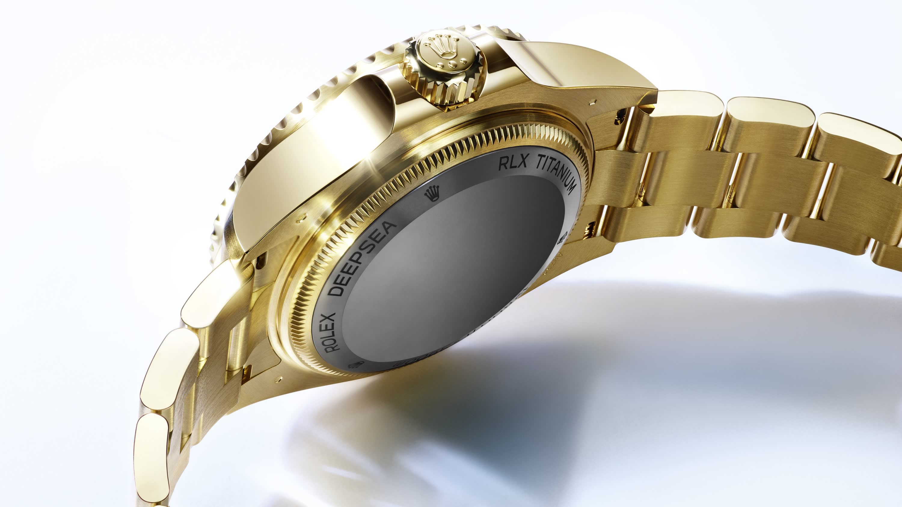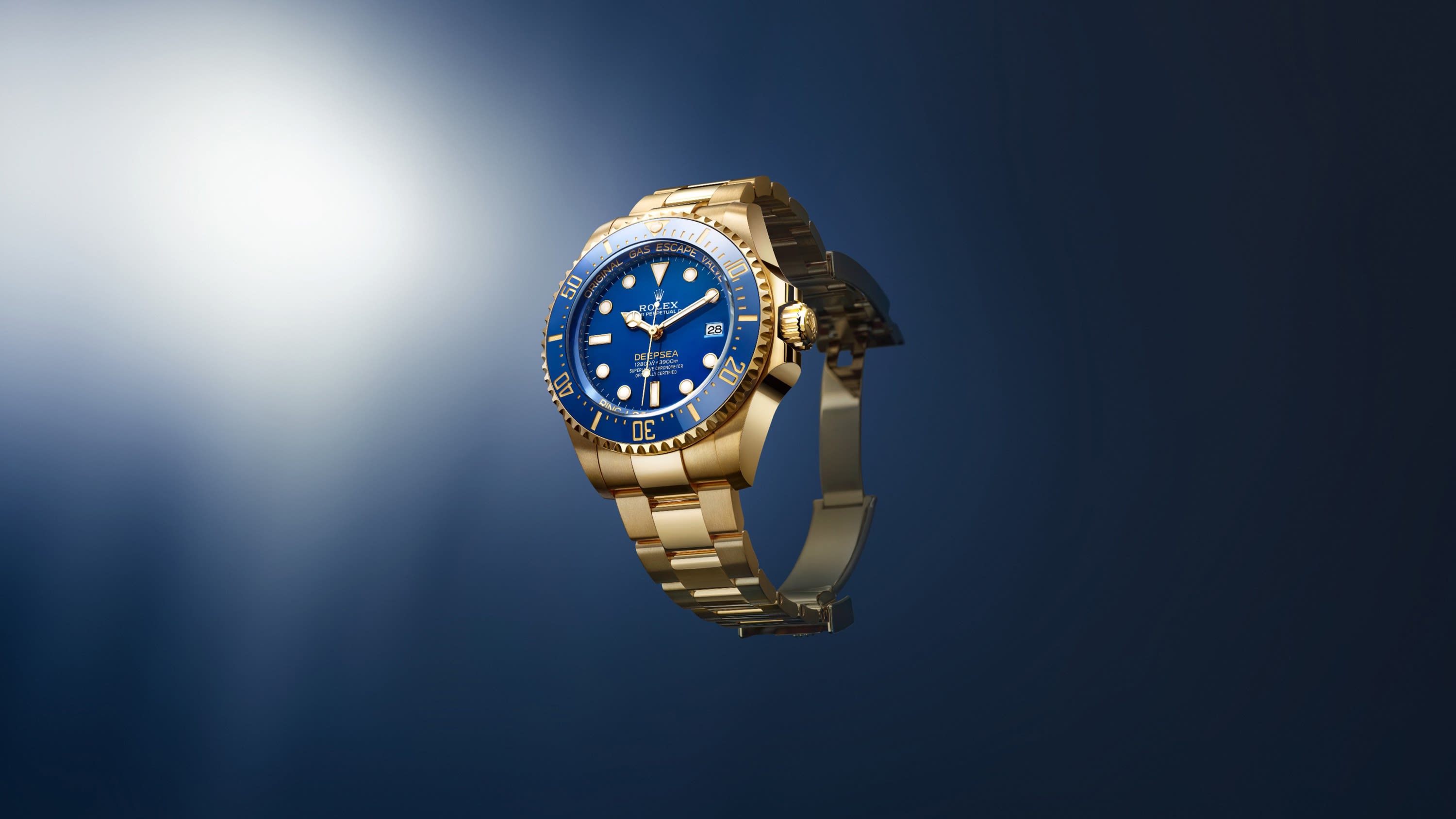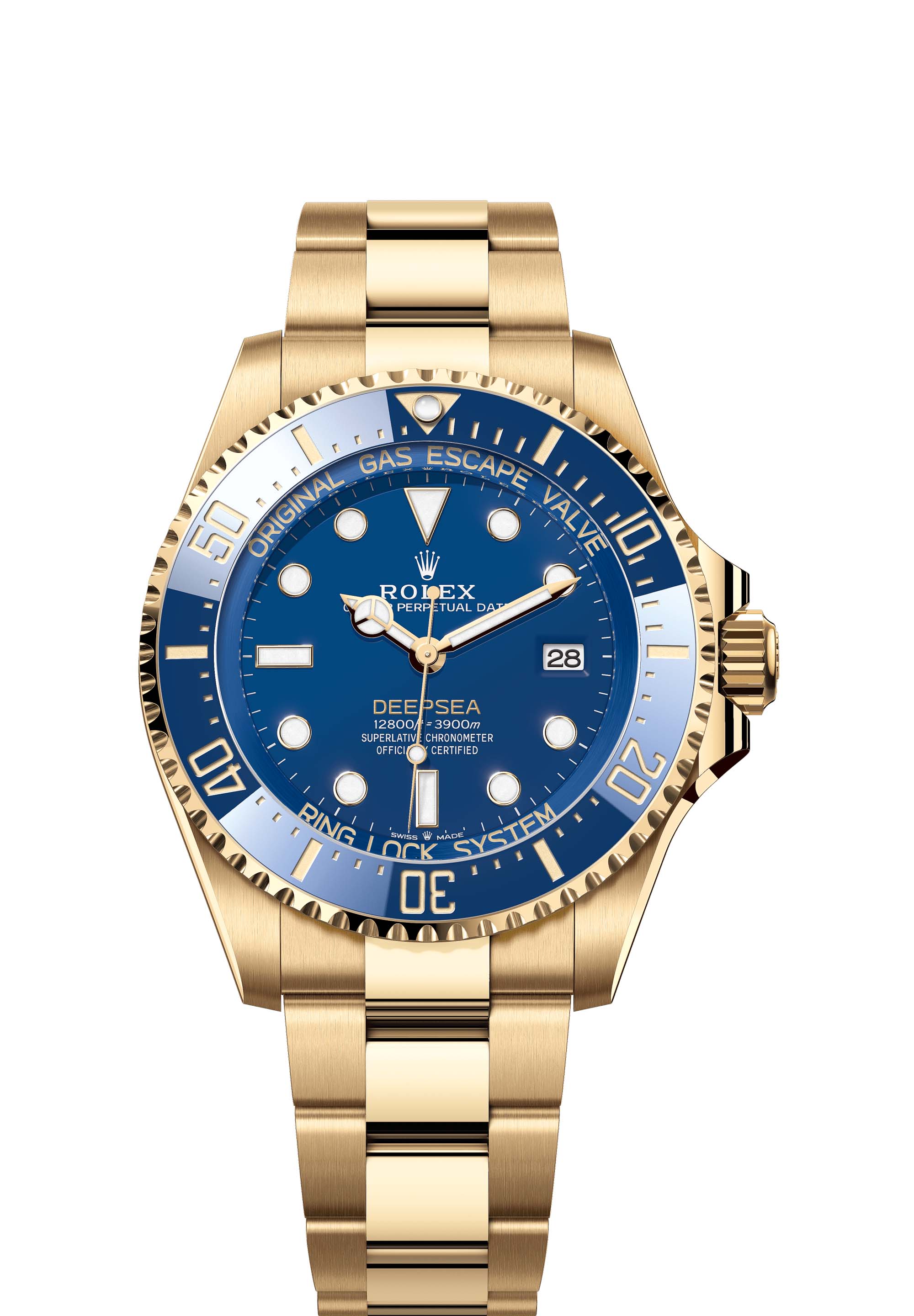 The Oyster Perpetual Rolex Deepsea in 18 ct yellow gold with a Cerachrom bezel insert in blue ceramic and an Oyster bracelet.