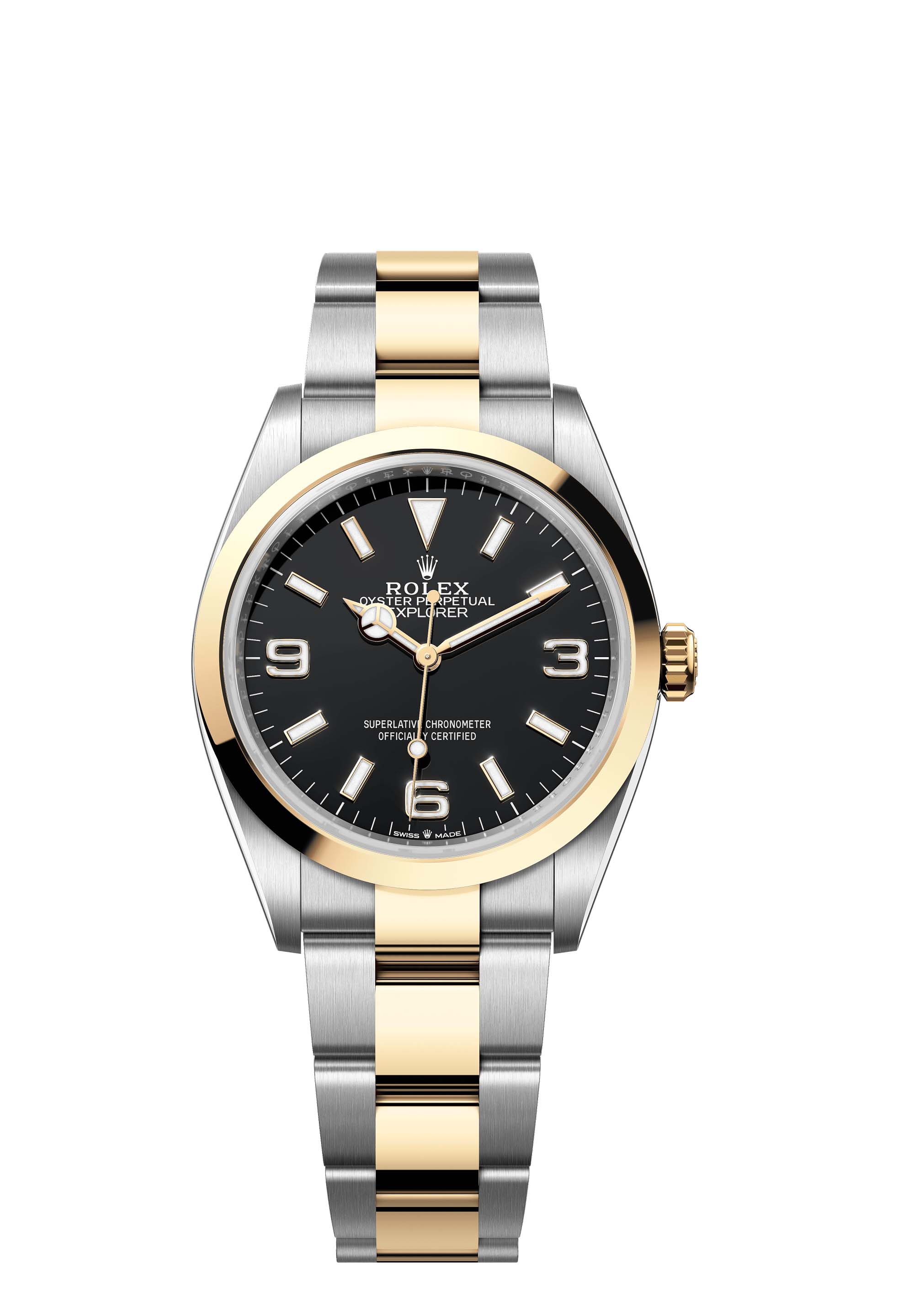 The Oyster Perpetual Explorer 36 in Oystersteel and yellow gold features a distinctive black dial with characteristic 3, 6, and 9 numerals with a Chromalight display.
