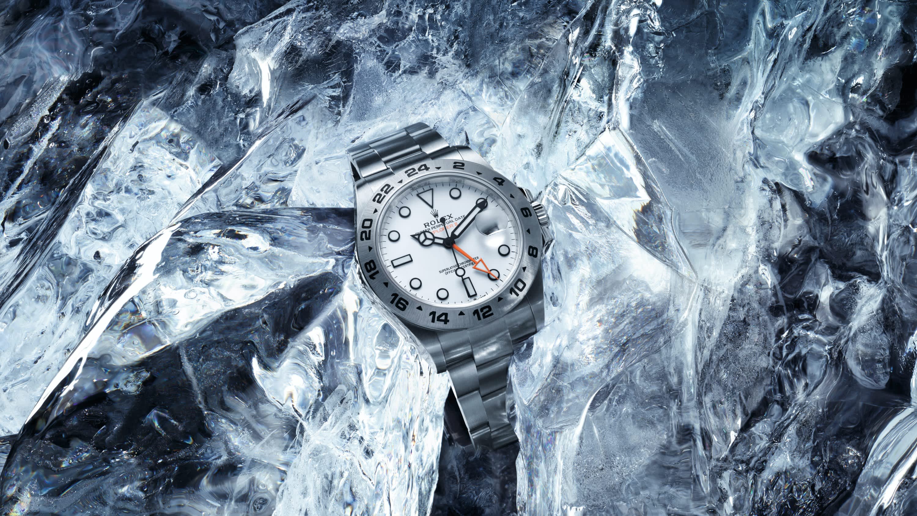 The Explorer II features a date display, an additional orange 24-hour hand and a fixed bezel with 24-hour graduations, enabling day to be distinguished from night. It became the watch of choice for speleologists, volcanologists and polar explorers. Its hour markers and hands feature a highly-legible Chromalight display with long-lasting blue luminescence.