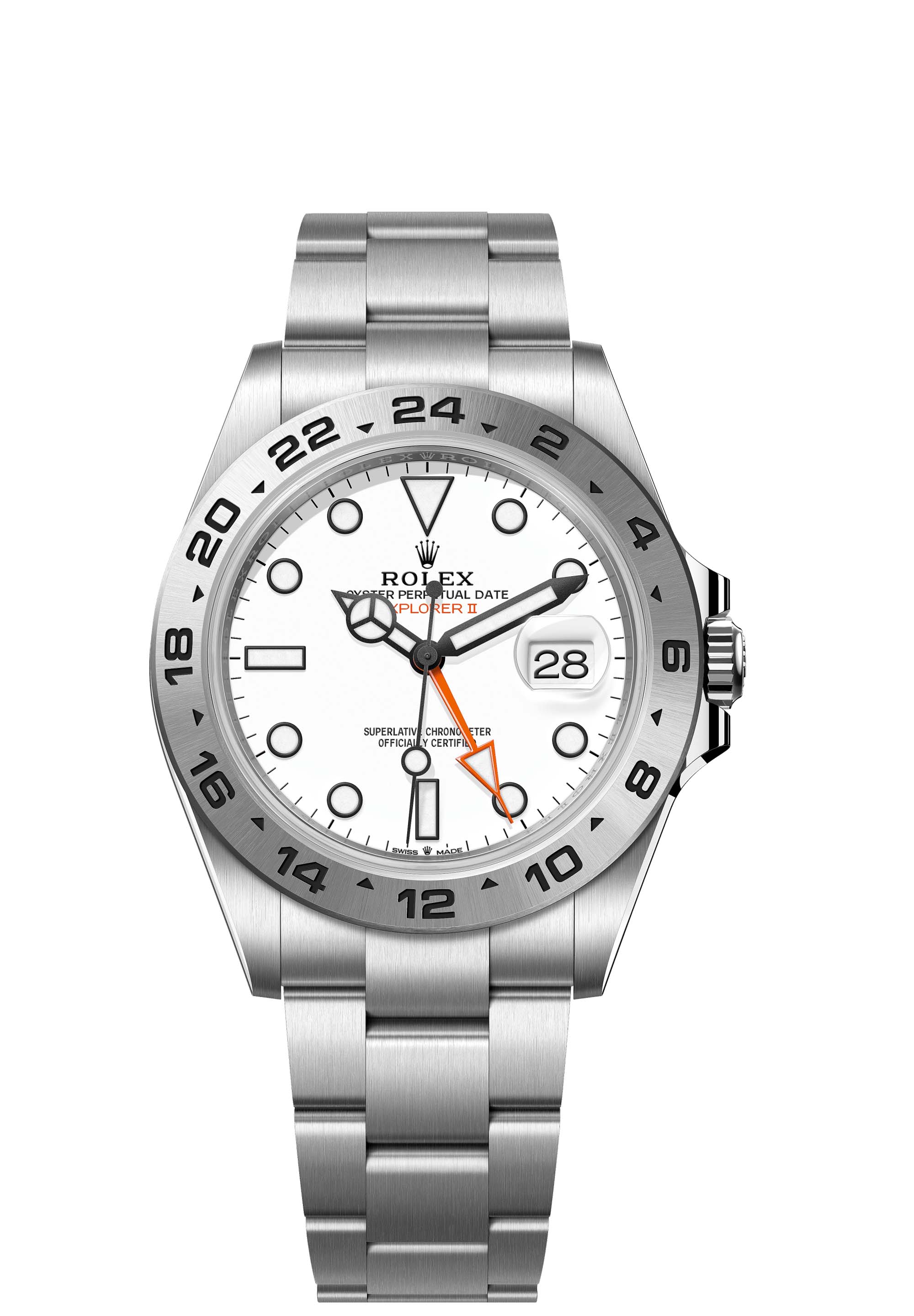 This Oyster Perpetual Explorer II in Oystersteel with an Oyster bracelet features a white dial with an arrow-shaped 24-hour hand and hour markers with a Chromalight display.