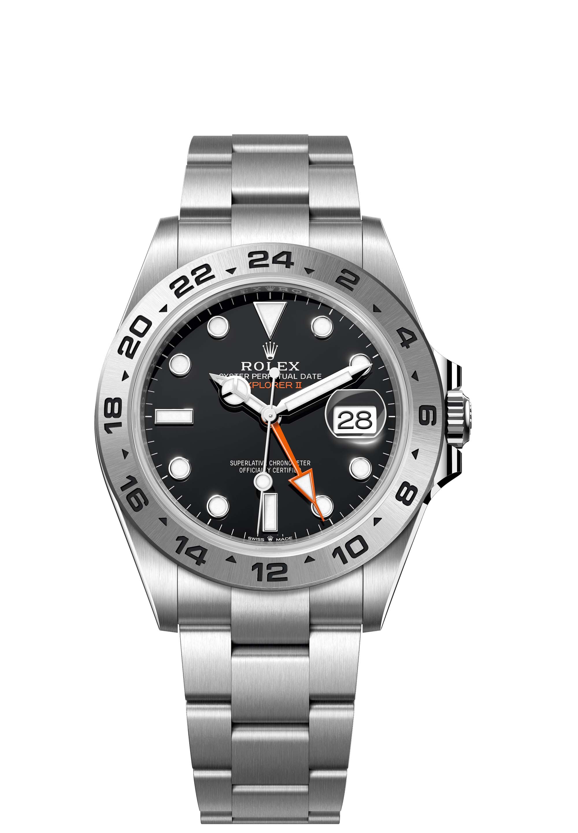 This Oyster Perpetual Explorer II in Oystersteel with an Oyster bracelet features a black dial with an arrow-shaped 24-hour hand and hour markers with a Chromalight display.