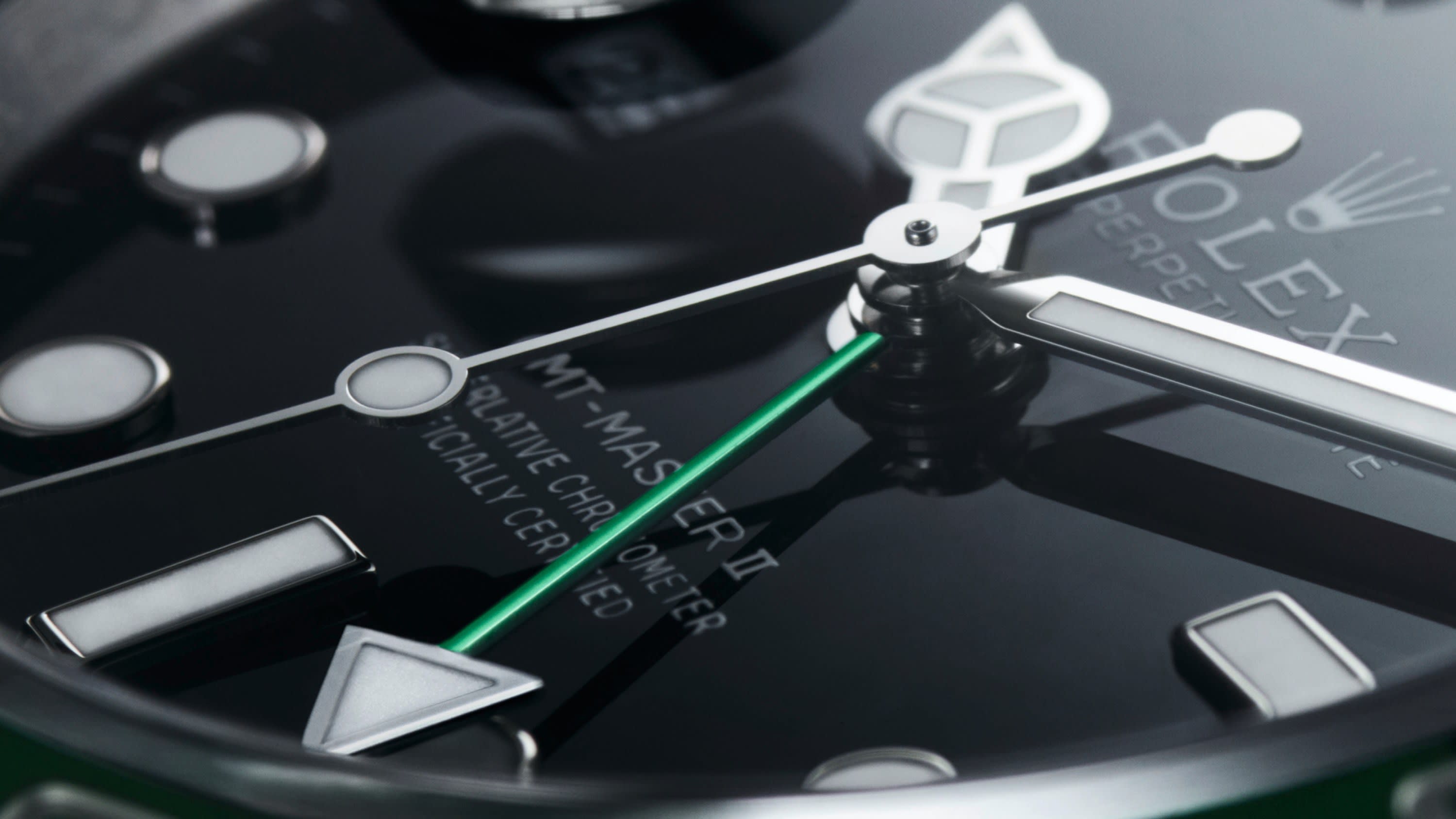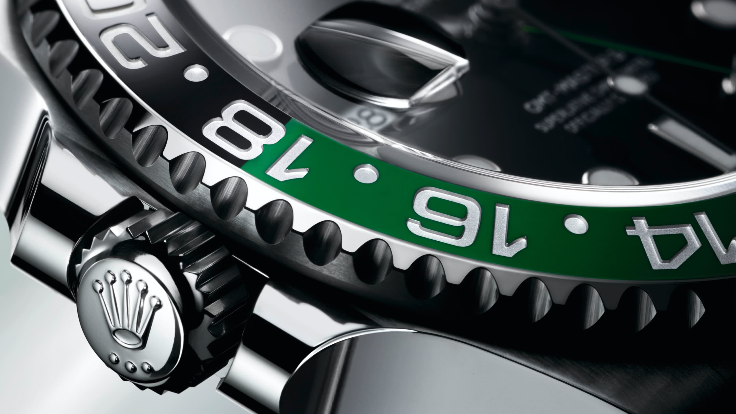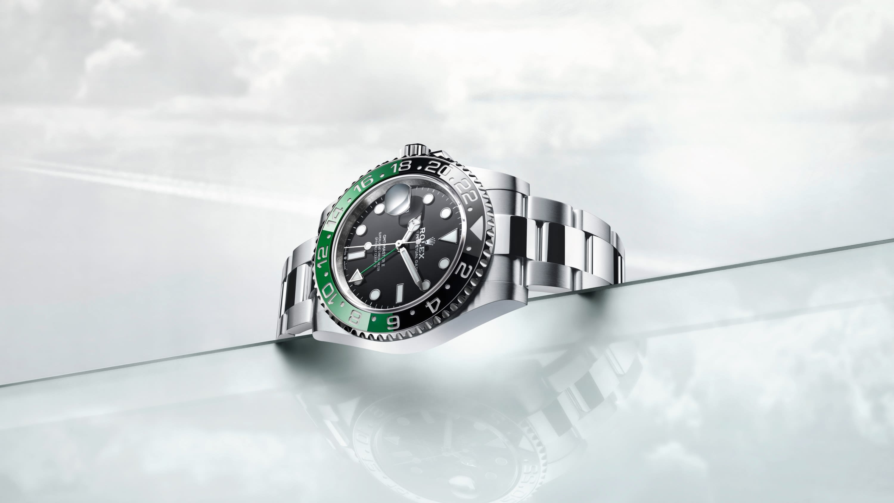 With traditional hour, minute and seconds hands, a triangle-tipped 24-hour hand, and a bidirectional rotatable bezel with 24-hour graduated Cerachrom insert, the GMT-Master II can display the time in two time zones simultaneously: either the local time and the reference time, or the local time and that of an alternative time zone. The date, at 9 o’clock on the dial, is synchronized with the local time.