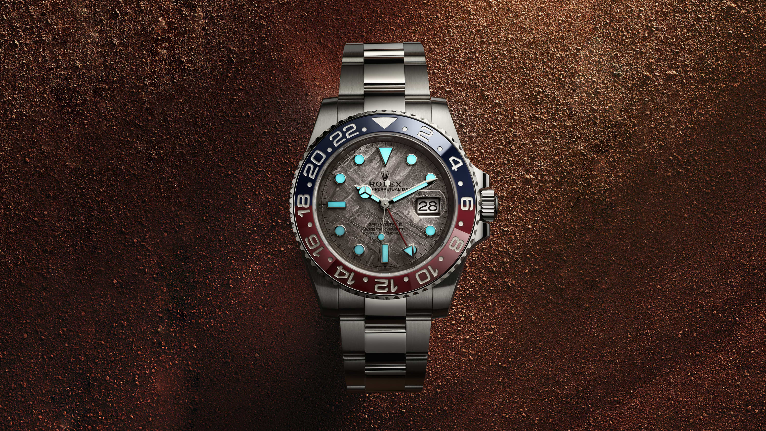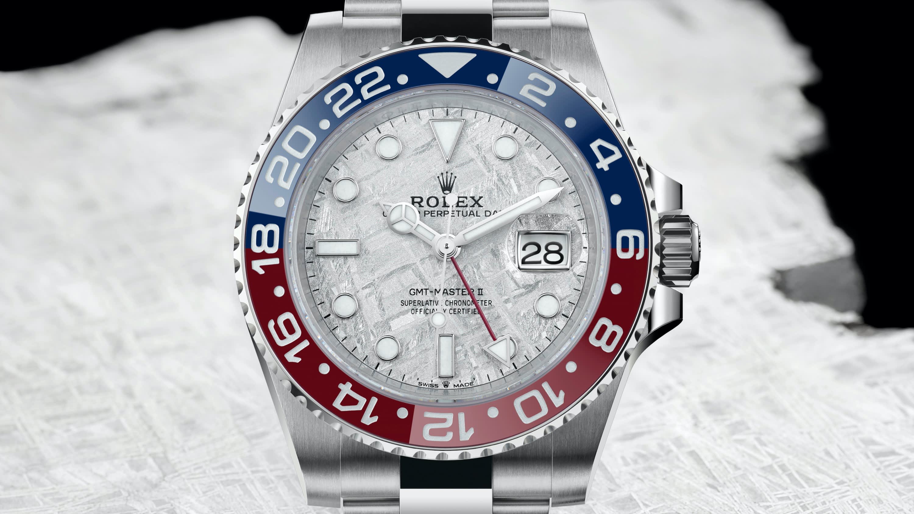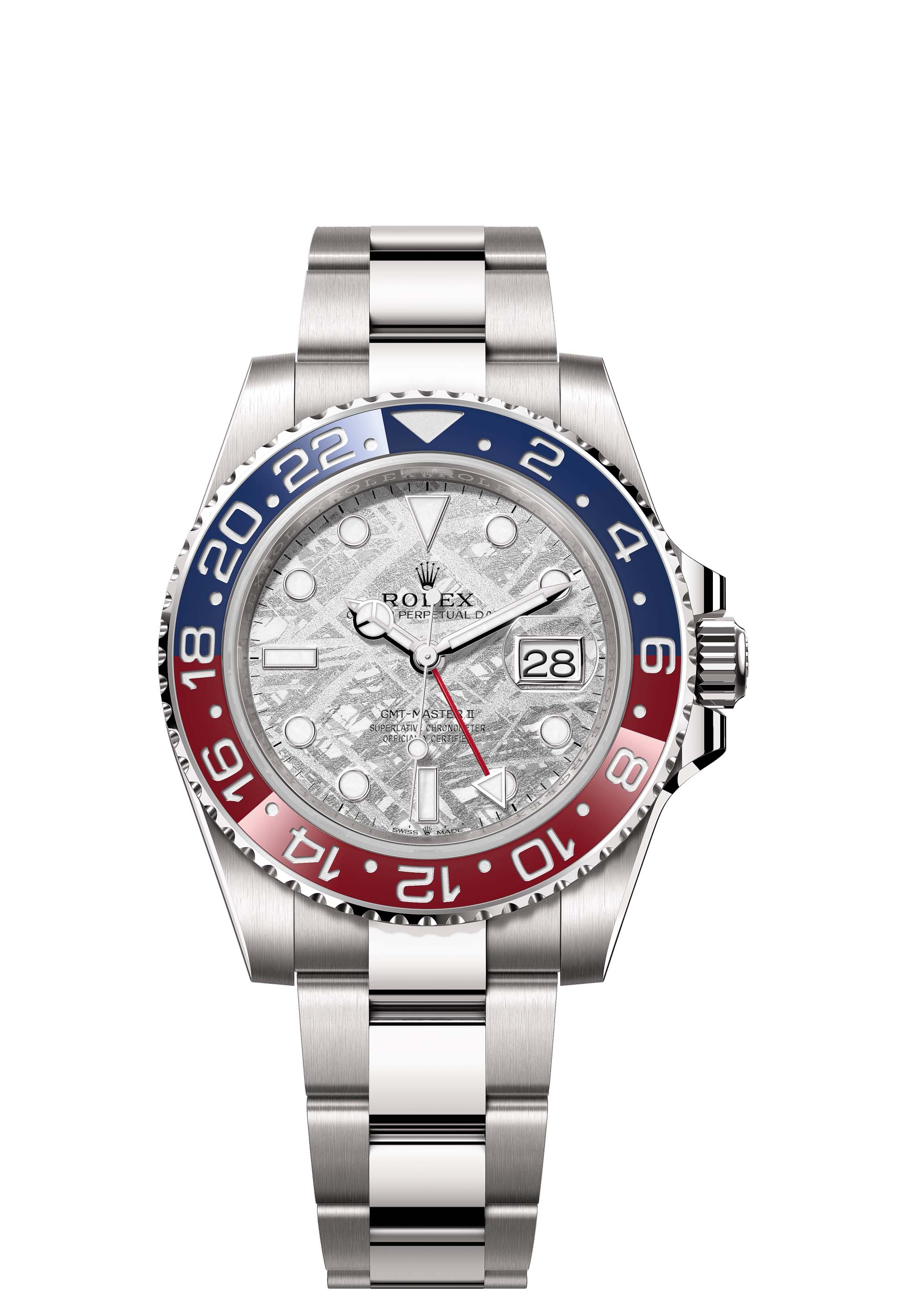 The Oyster Perpetual GMT-Master II in 18 ct white gold with a meteorite dial and an Oyster bracelet.