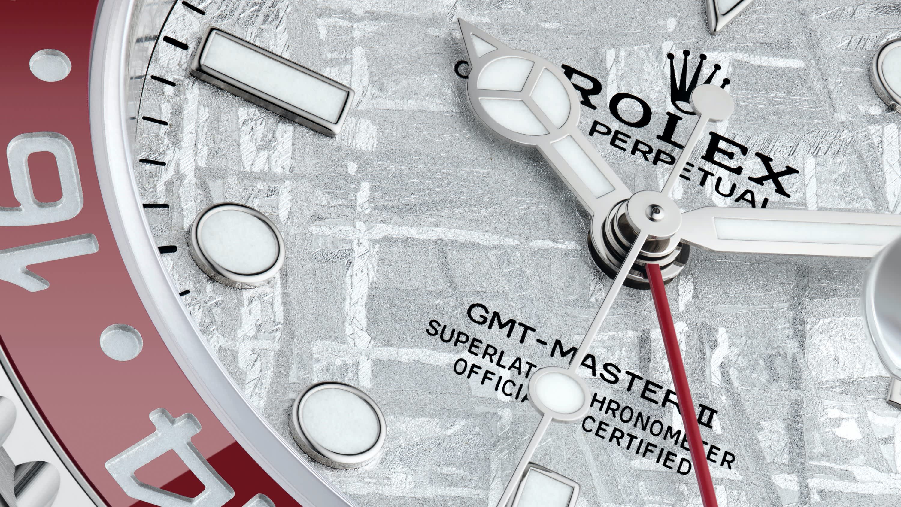 This model is the only GMT-Master II with a meteorite dial. Meteorite comes from the heart of an asteroid or possibly even a planet that has exploded, propelling material across the Solar System until chance brings it into our planet’s orbit and gravity pulls it to Earth. During its journey, the centre of the meteorite is gradually transformed, producing highly unusual metallic patterns, resulting from the very slow cooling of molten asteroid cores. The designers at Rolex create from these configurations a unique treasure for some of the most prestigious models, including this GMT-Master II.