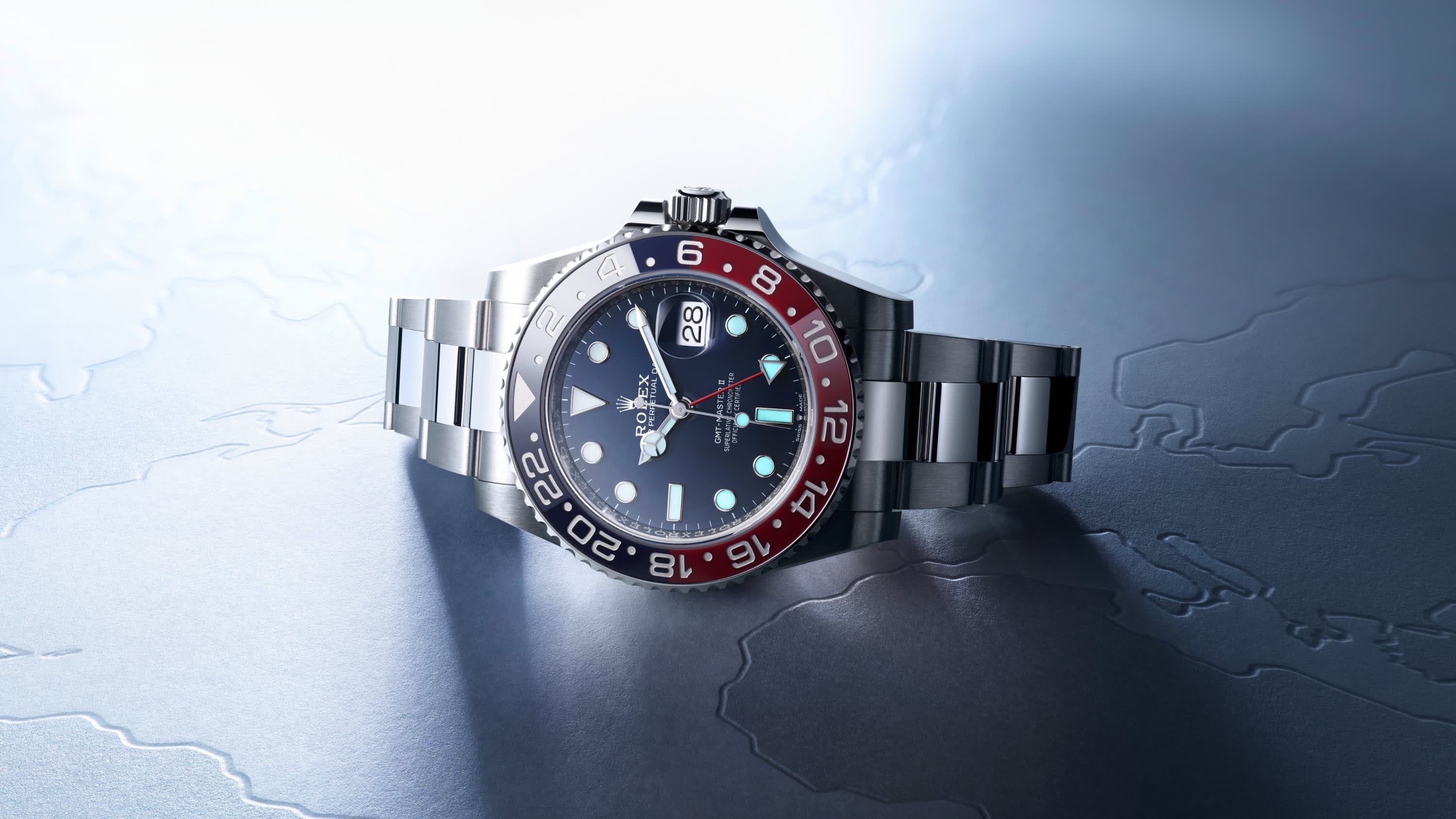 This model features a midnight blue dial and a two-colour Cerachrom bezel insert in red and blue ceramic. In addition to conventional hour, minute and seconds hands, the GMT-Master II features an arrow-tipped hand, which circles the dial once every 24 hours, as well as a bidirectional rotatable 24-hour graduated bezel. The distinctively coloured 24-hour hand displays the “home” reference time in a first time zone which can be read on the graduations on the bezel. The traveller’s local time is easily set by “jumping” from hour to hour, thanks to an ingenious mechanism operated via the winding crown: the hour hand can be adjusted forwards or backwards independently of the minute and seconds hands. This allows travellers to adapt to their new time zone without affecting the precision of their timekeeping.