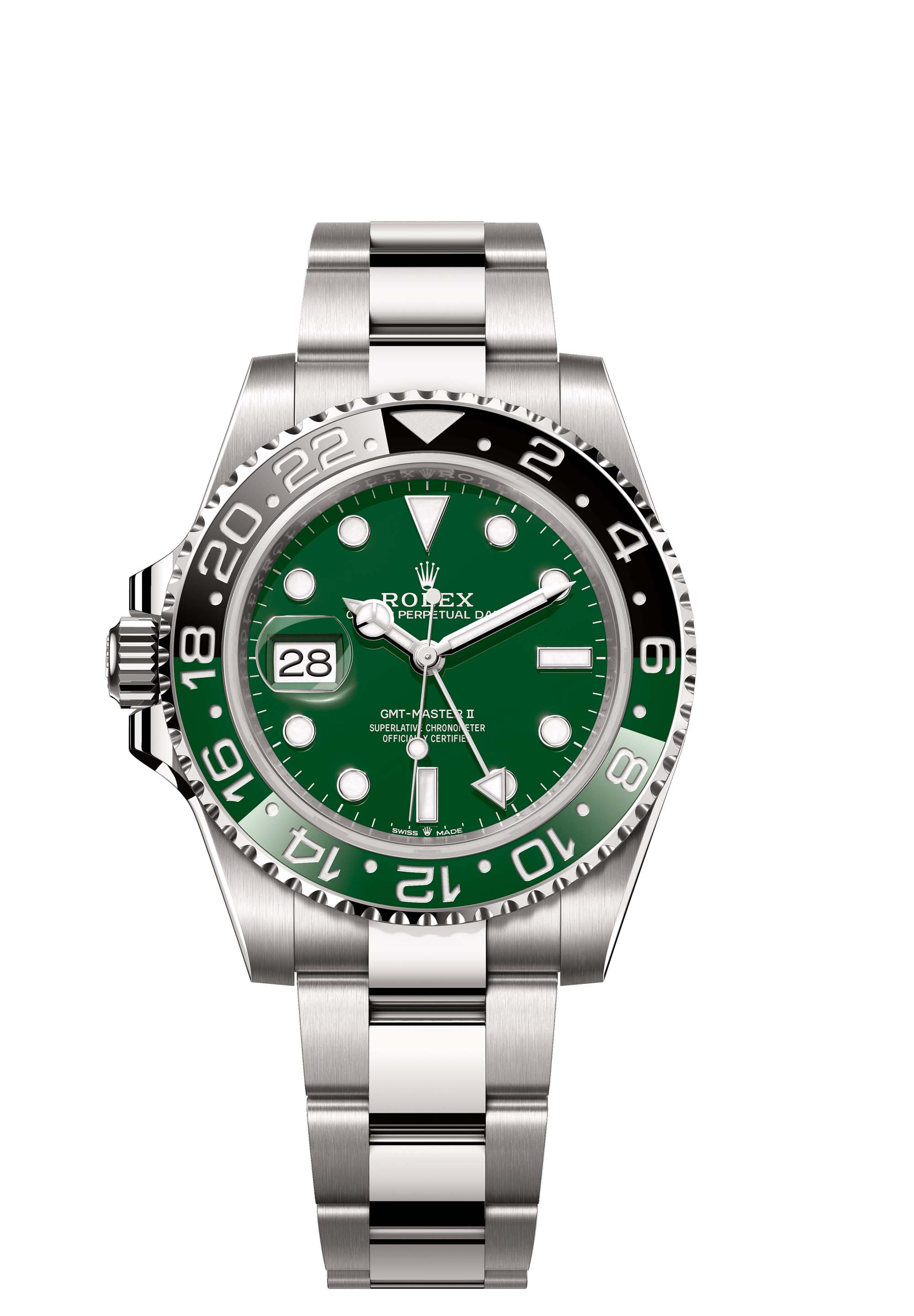 The Oyster Perpetual GMT-Master II in 18 ct white gold with a green ceramic dial and an Oyster bracelet.