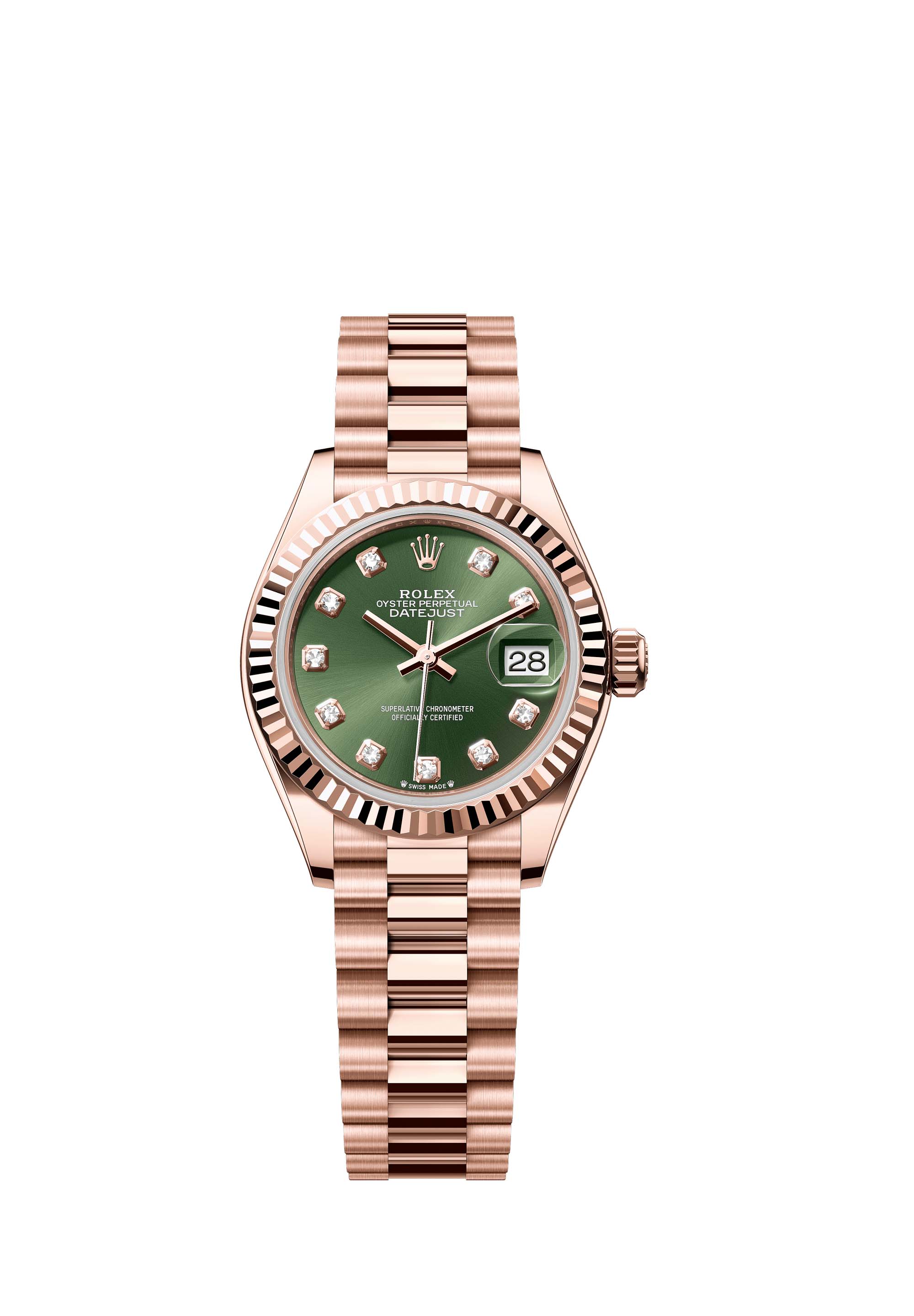 This Oyster Perpetual Lady-Datejust in 18 ct Everose gold features an olive-green, diamond-set dial and a President bracelet.