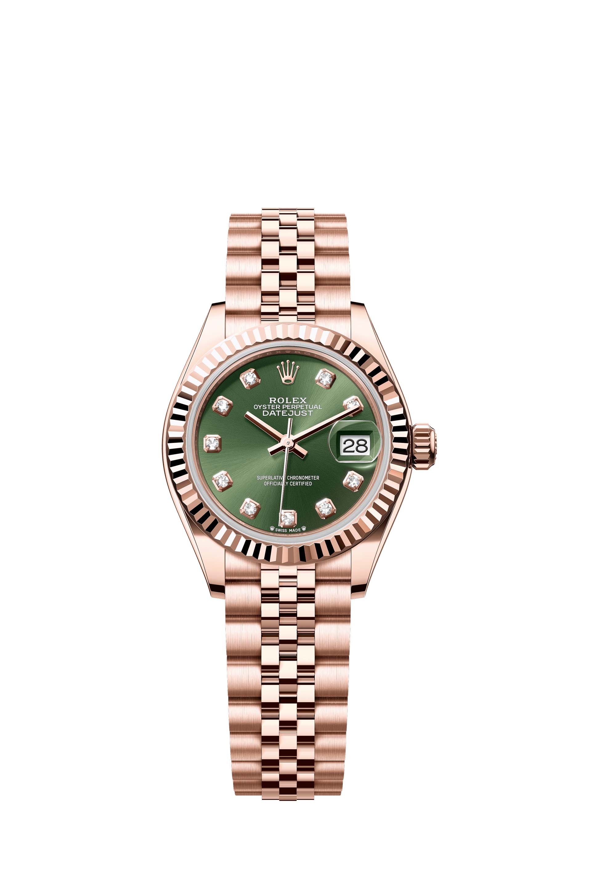 This Oyster Perpetual Lady-Datejust in 18 ct Everose gold features an olive-green, diamond-set dial and a Jubilee bracelet.