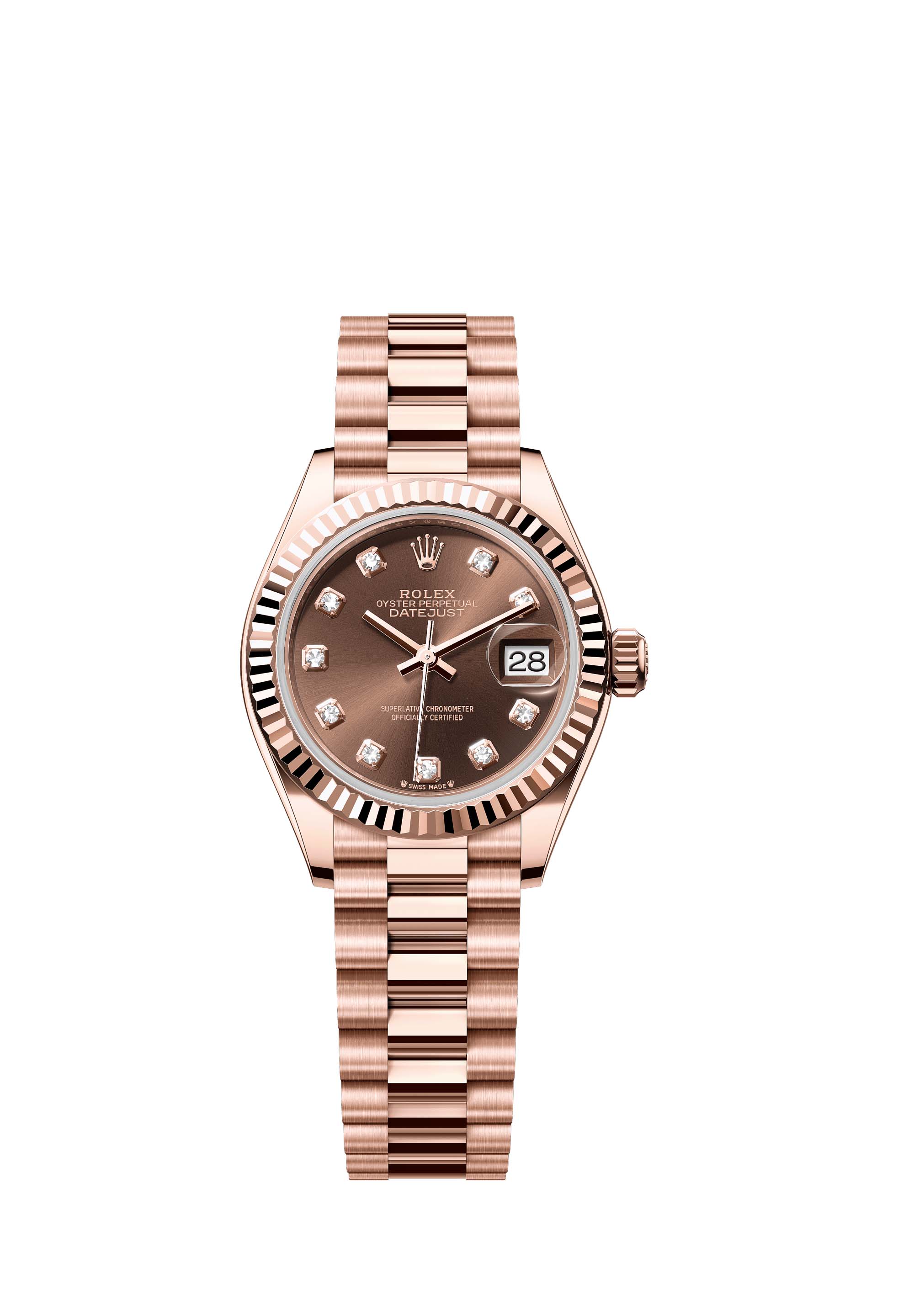 This Oyster Perpetual Lady-Datejust in 18 ct Everose gold features a chocolate, diamond-set dial and a President bracelet.