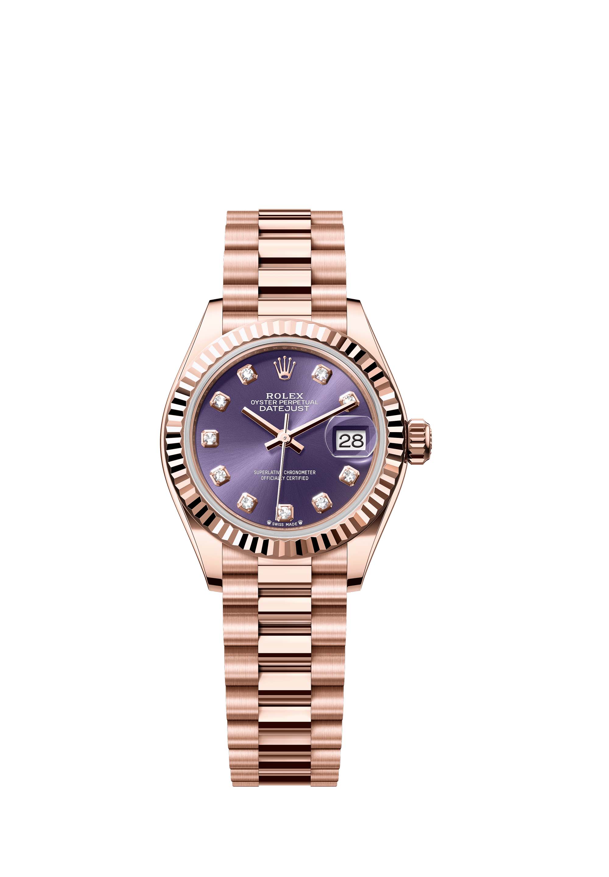 This Oyster Perpetual Lady-Datejust in 18 ct Everose gold features an aubergine, diamond-set dial and a President bracelet.