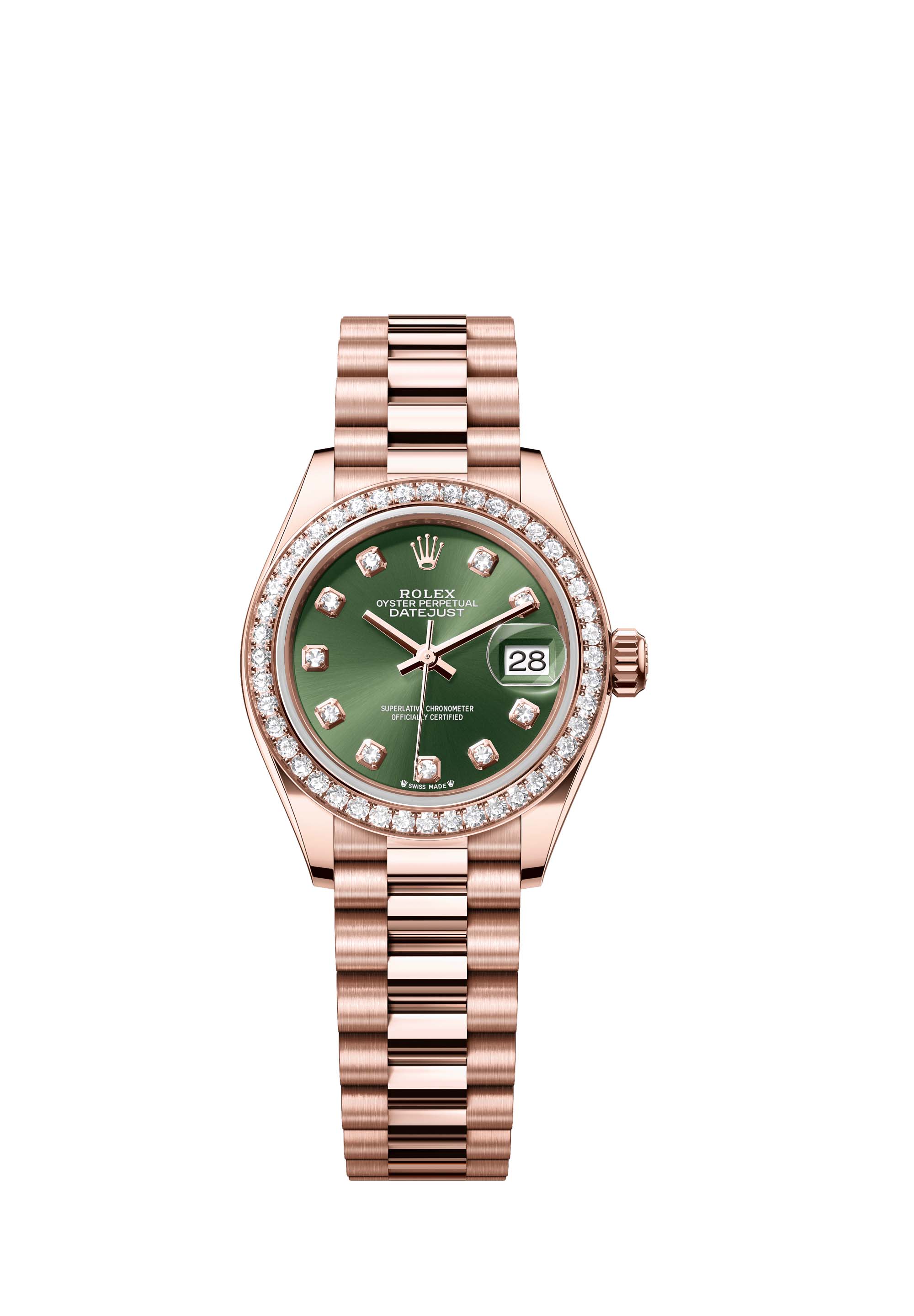 This Oyster Perpetual Lady-Datejust in 18 ct Everose gold features an olive-green, diamond-set dial and a President bracelet.