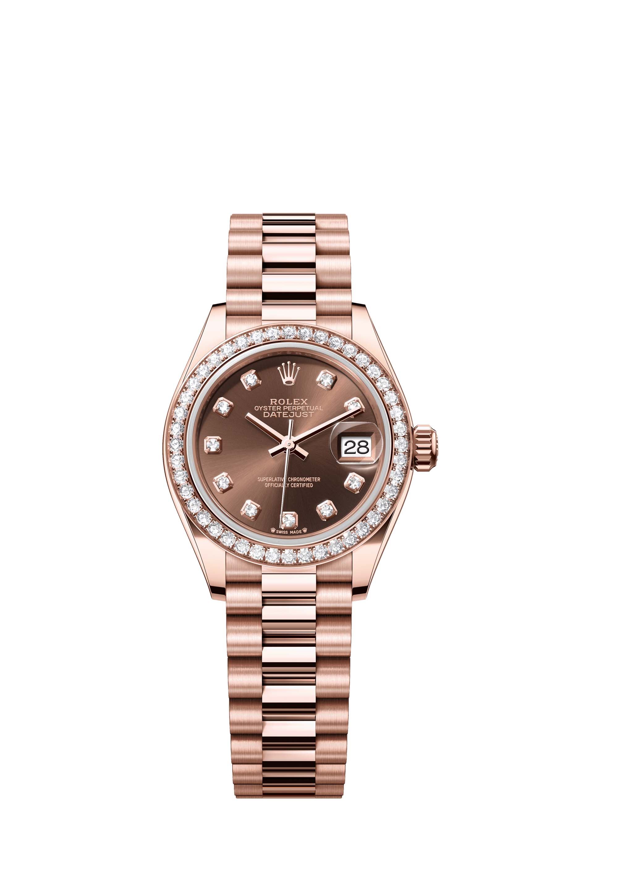 This Oyster Perpetual Lady-Datejust in 18 ct Everose gold features a chocolate, diamond-set dial and a President bracelet.