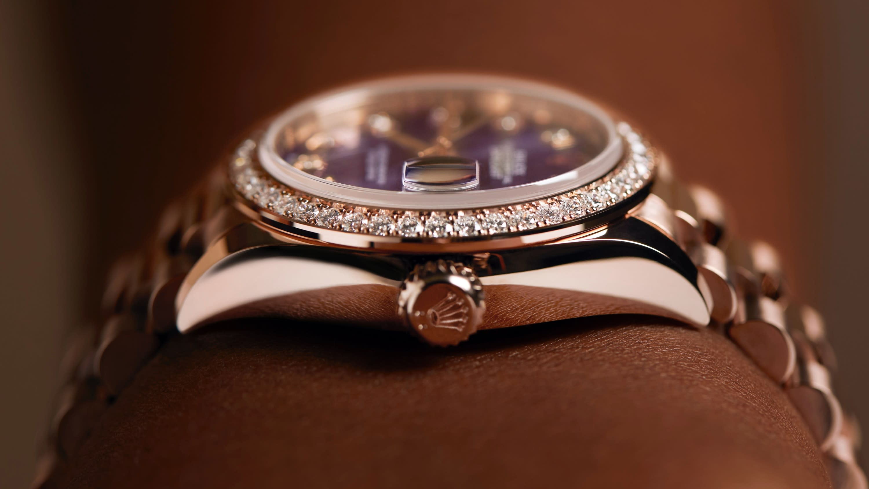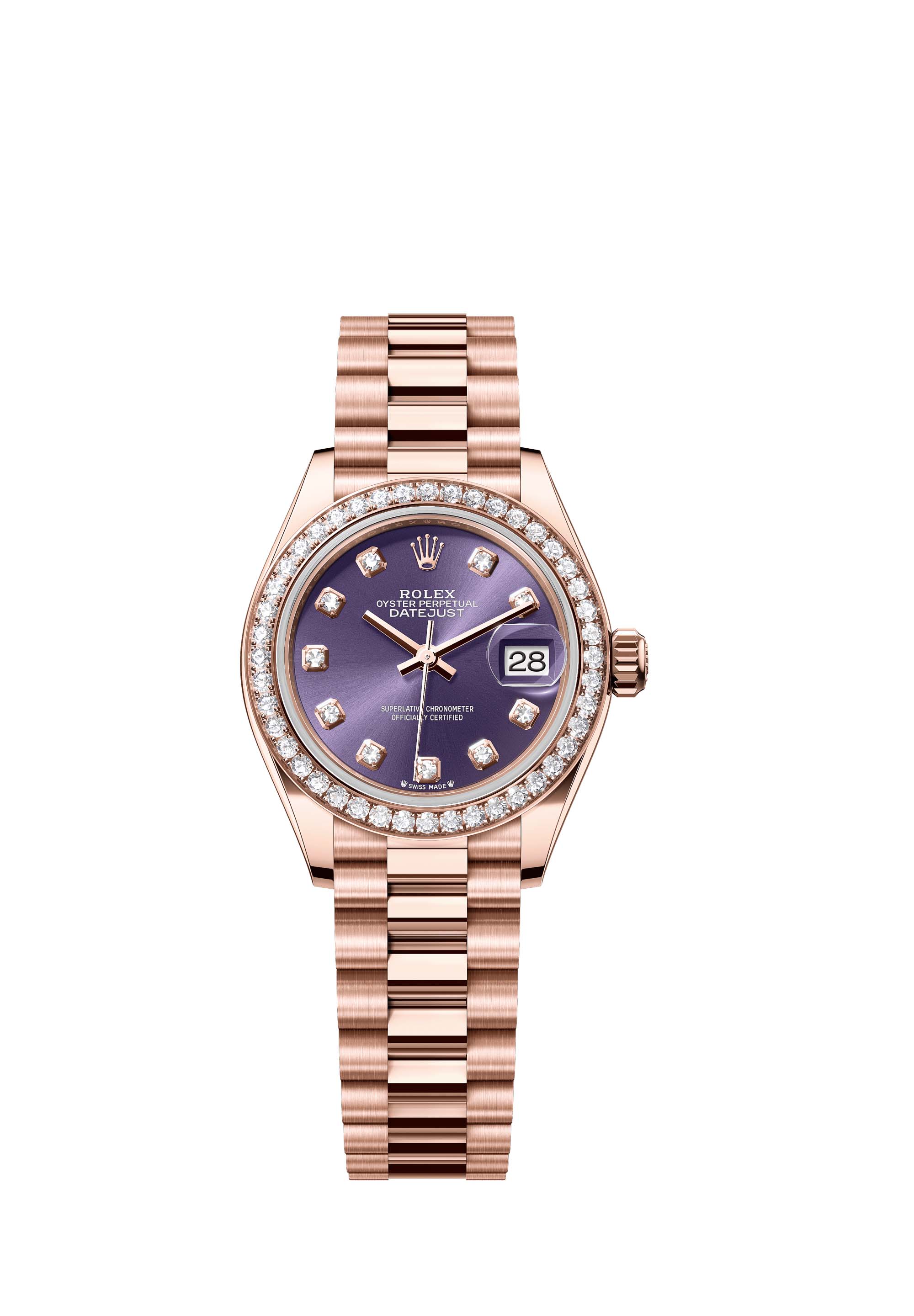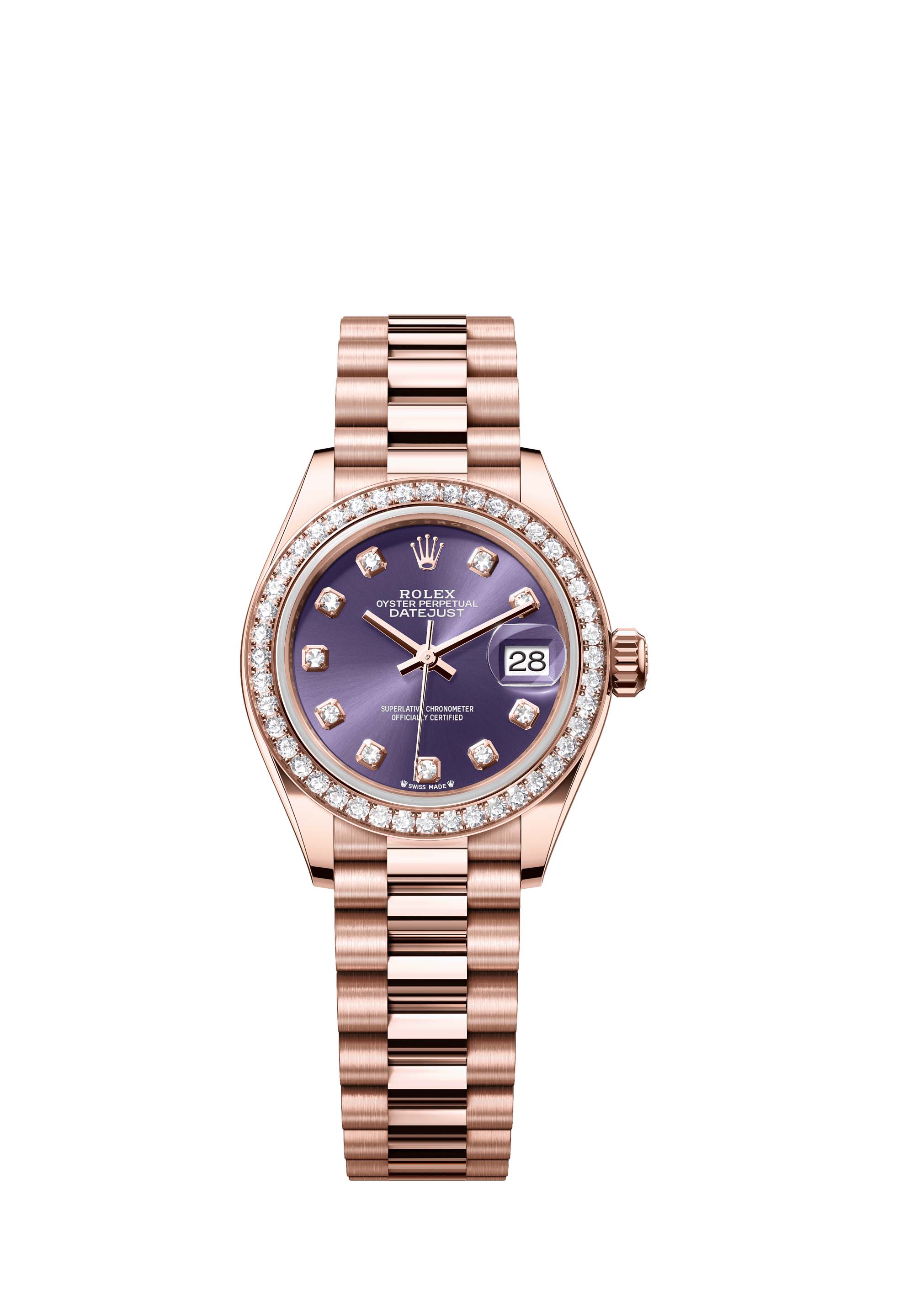 This Oyster Perpetual Lady-Datejust in 18 ct Everose gold features an aubergine, diamond-set dial and a President bracelet.