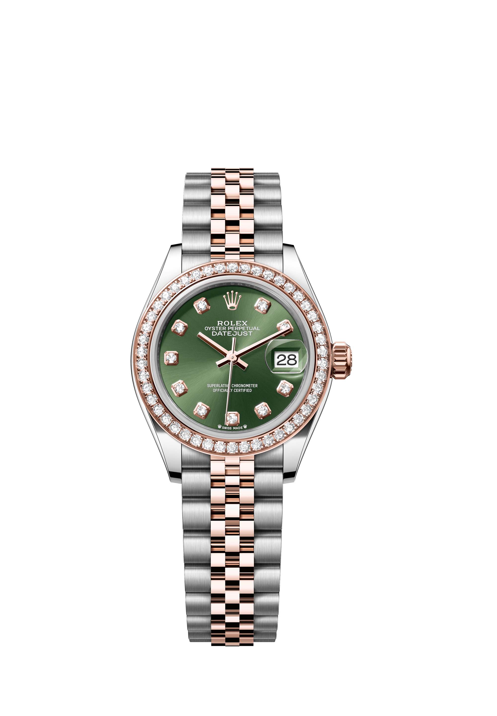 This Oyster Perpetual Lady-Datejust in Oystersteel and Everose gold features an olive-green, diamond-set dial and a Jubilee bracelet.