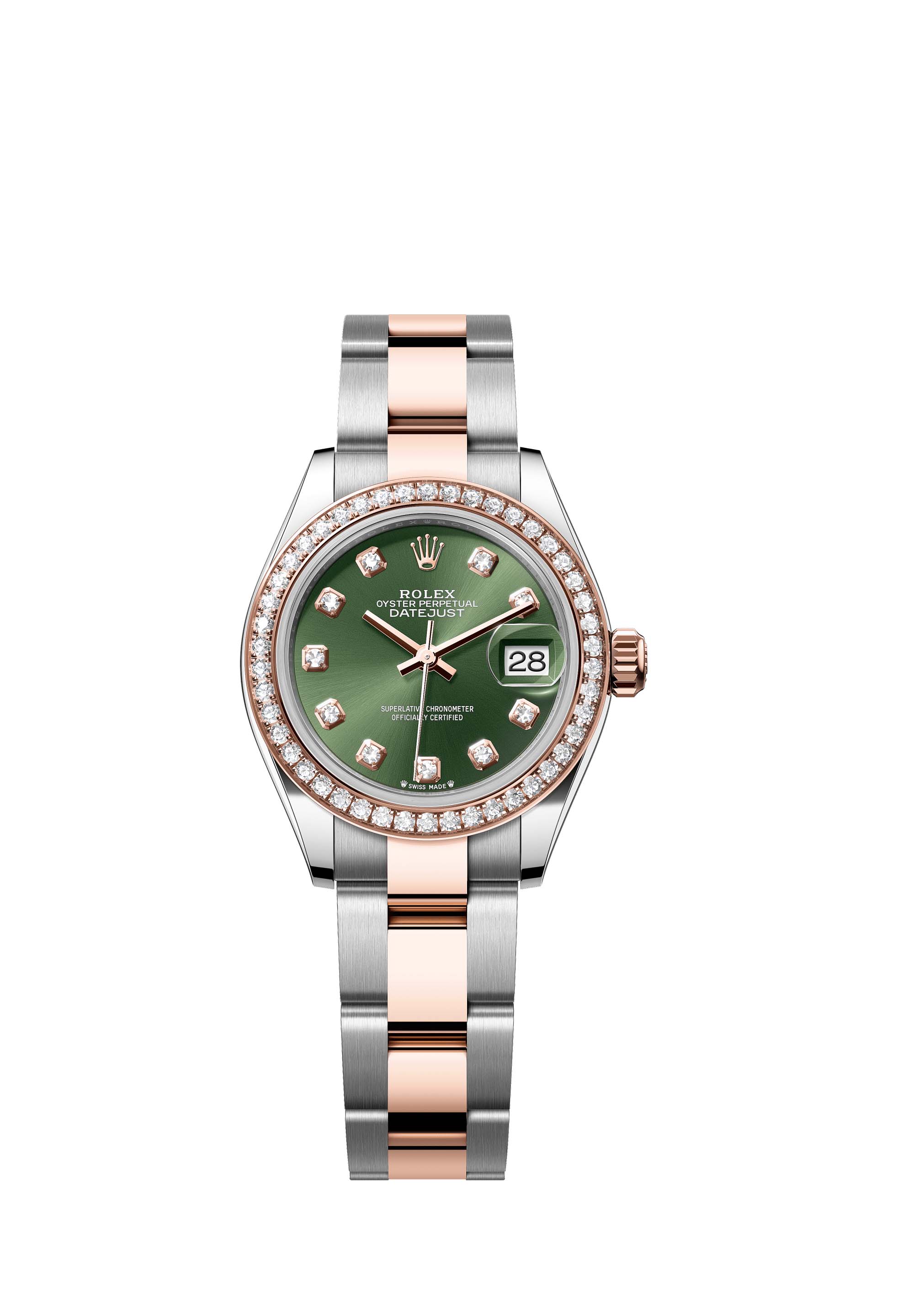 This Oyster Perpetual Lady-Datejust in Oystersteel and Everose gold features an olive-green, diamond-set dial and an Oyster bracelet.