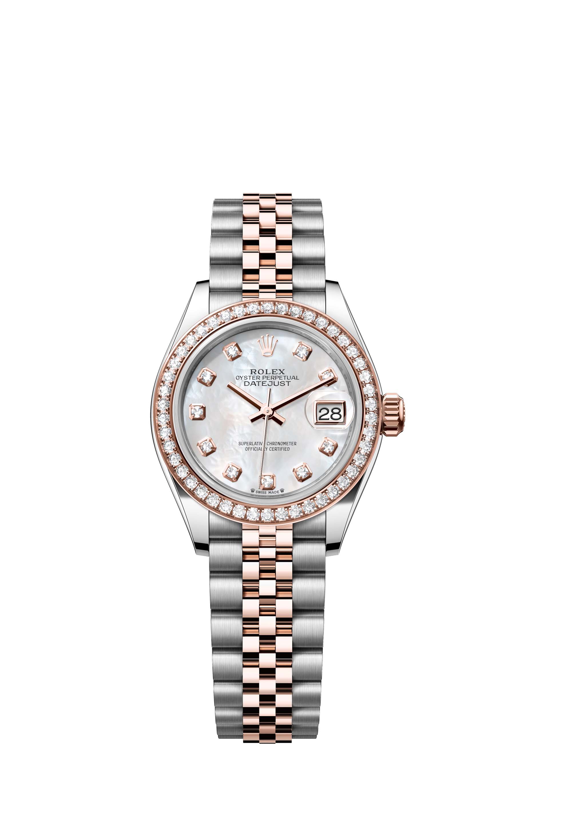 This Oyster Perpetual Lady-Datejust in Oystersteel and Everose gold features a white mother-of-pearl, diamond-set dial and a Jubilee bracelet.