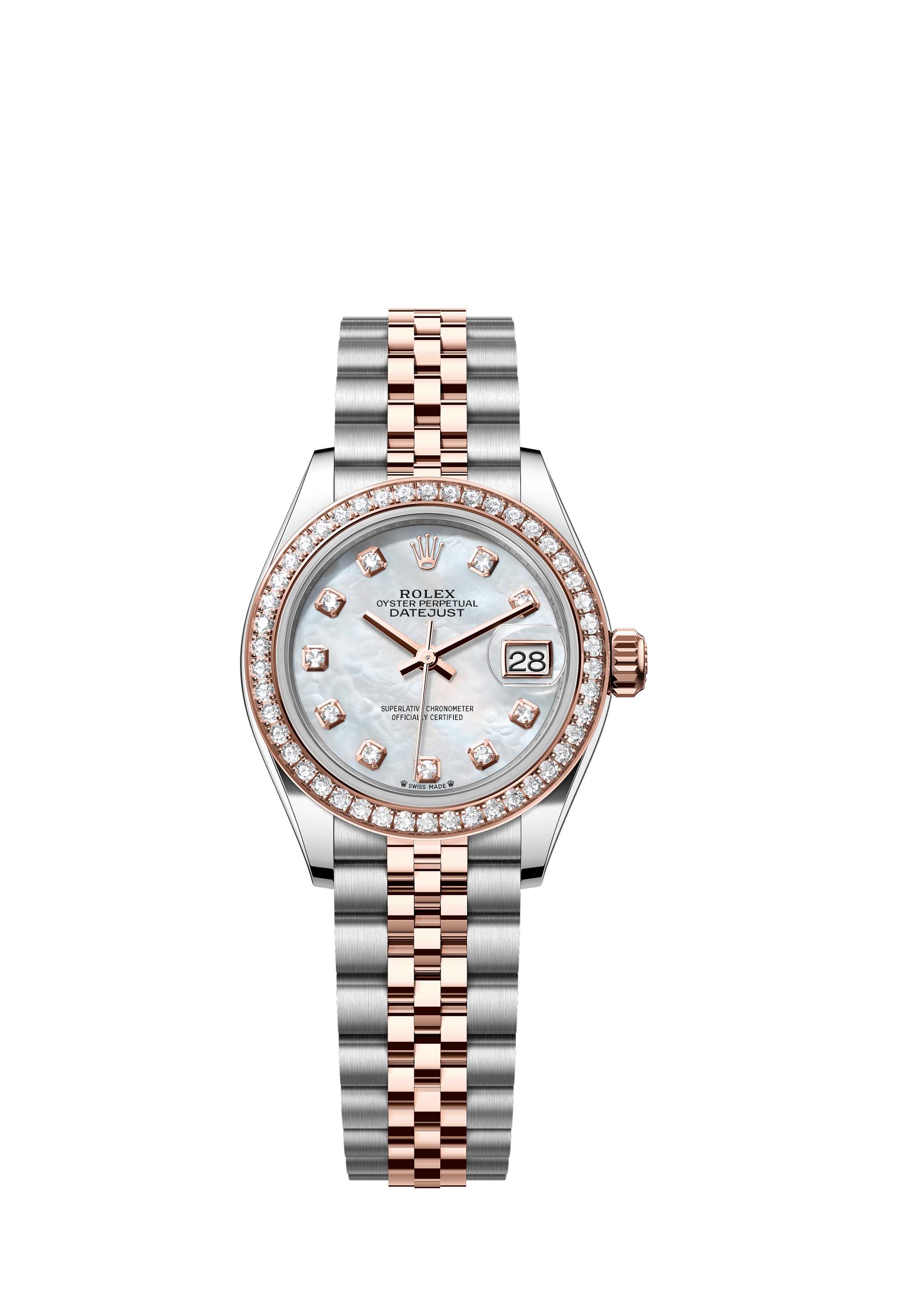 - Case : Oyster, 28 mm, Oystersteel, Everose gold and diamonds