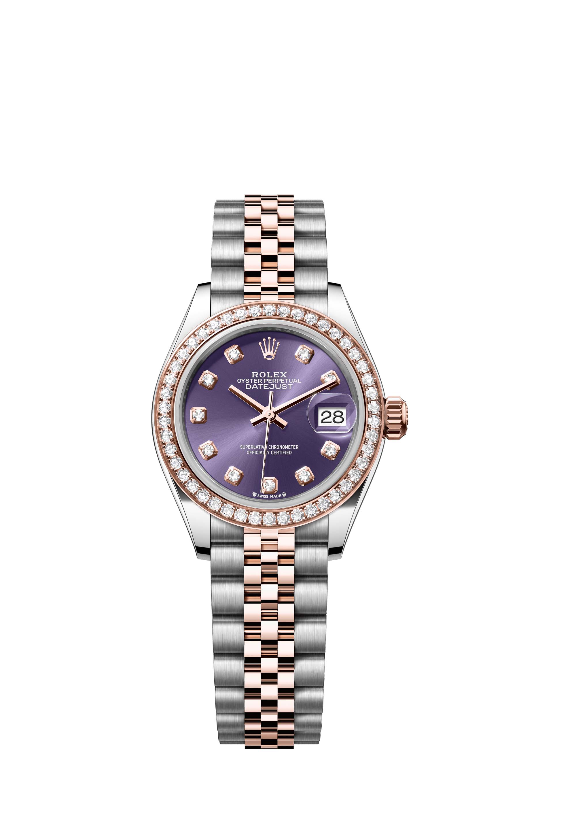 This Oyster Perpetual Lady-Datejust in Oystersteel and Everose gold features an aubergine, diamond-set dial and a Jubilee bracelet.