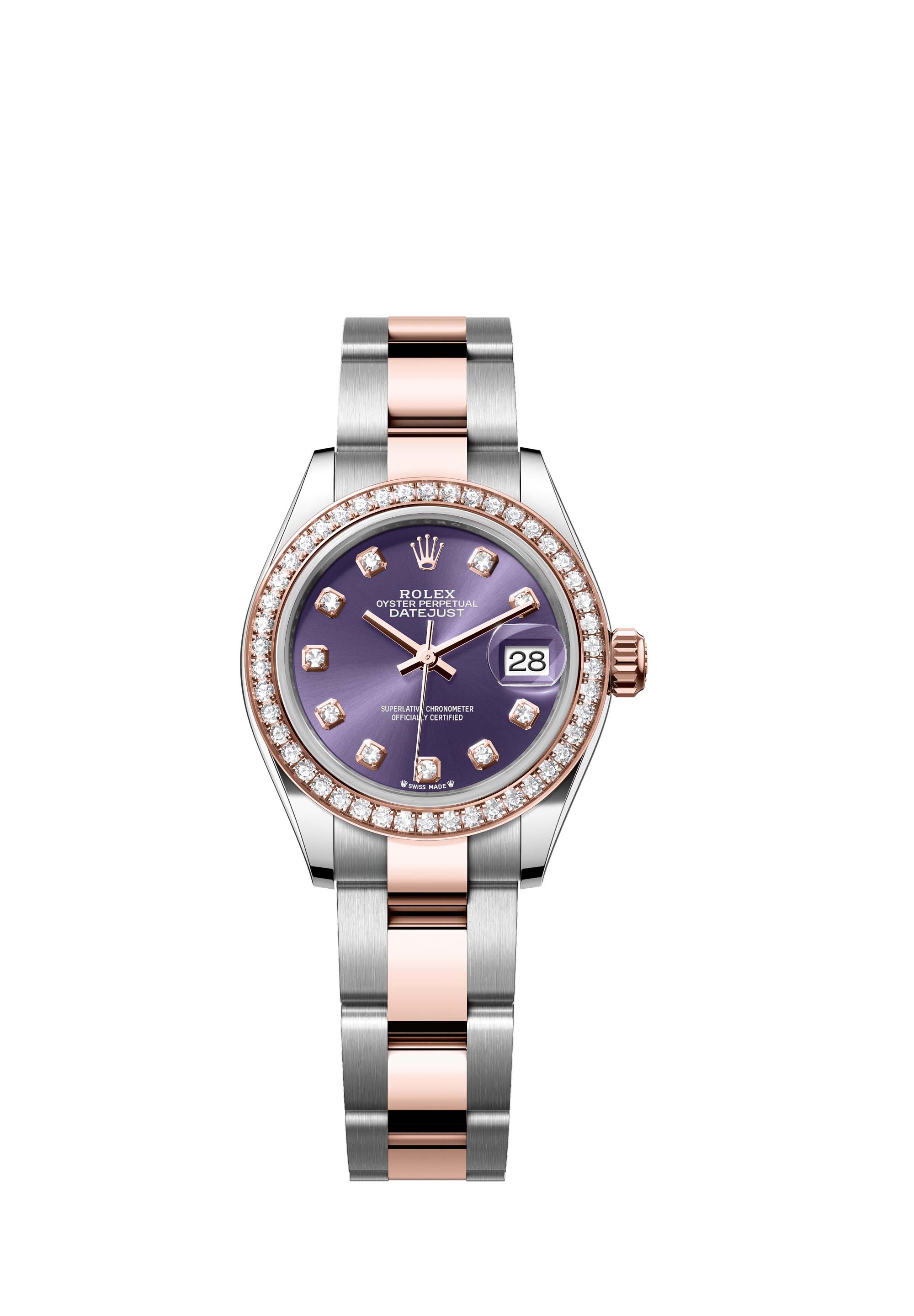 This Oyster Perpetual Lady-Datejust in Oystersteel and Everose gold features an aubergine, diamond-set dial and an Oyster bracelet.