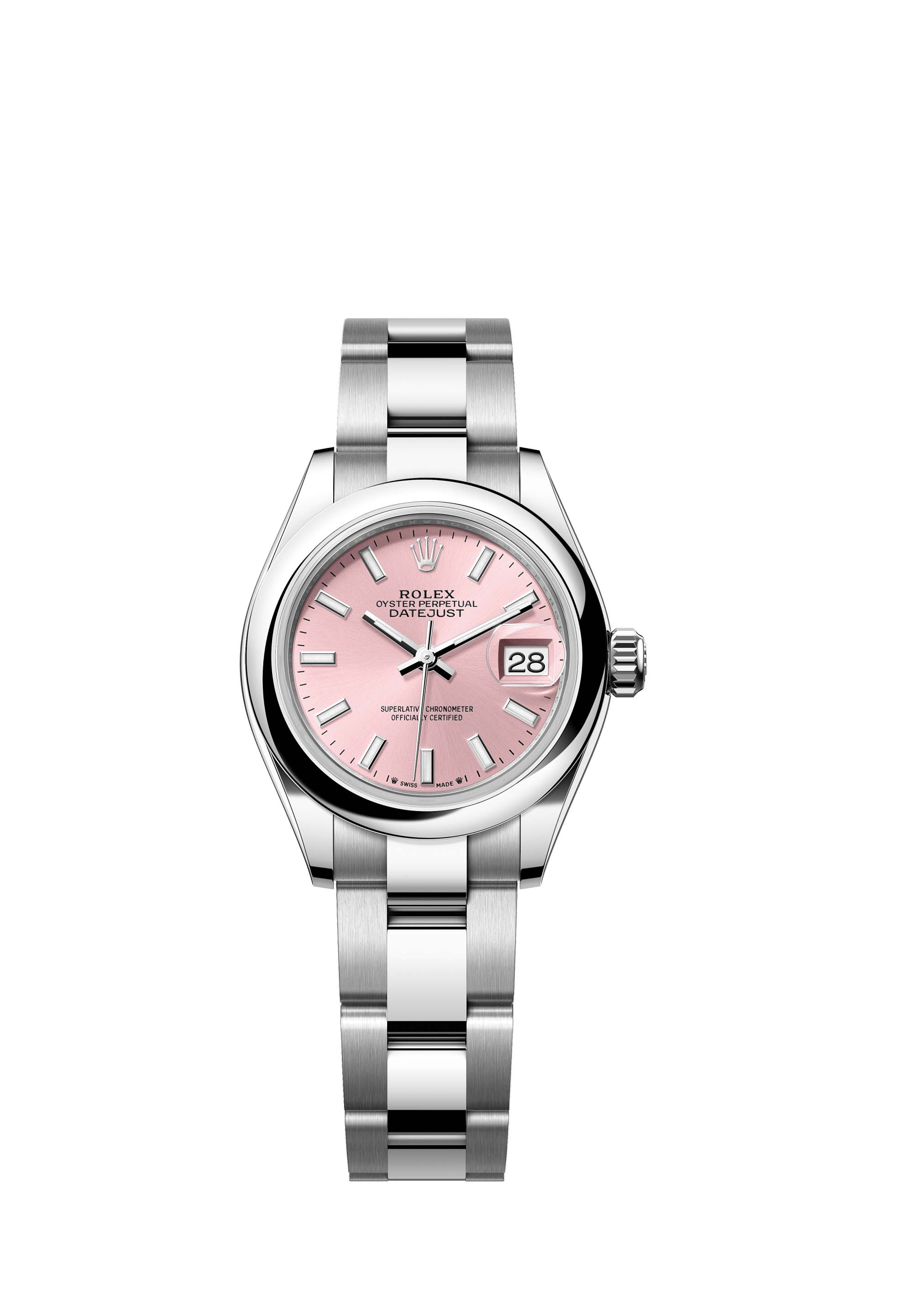 This Oyster Perpetual Lady-Datejust in Oystersteel features a pink dial and an Oyster bracelet.