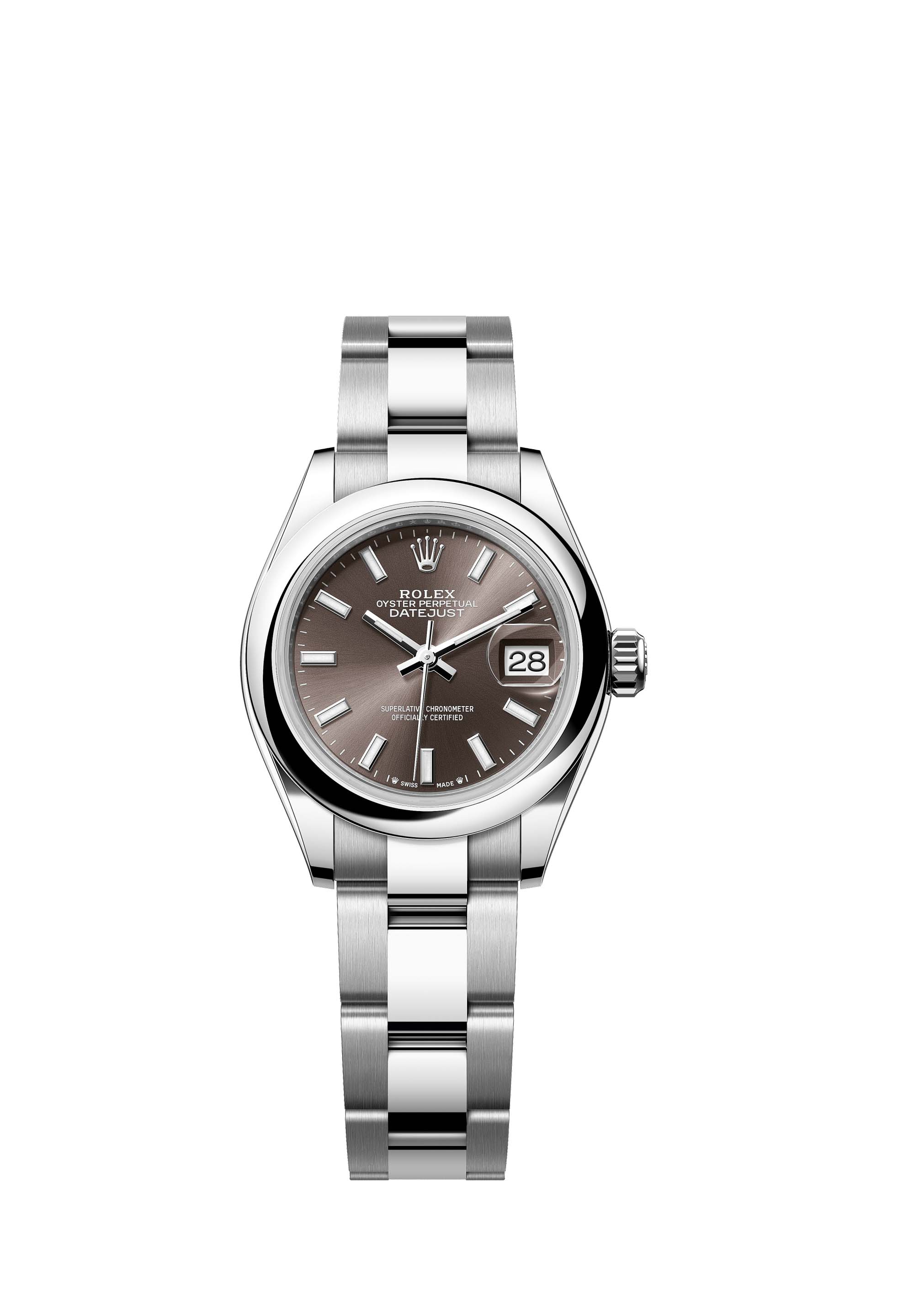 This Oyster Perpetual Lady-Datejust in Oystersteel features a dark grey dial and an Oyster bracelet.