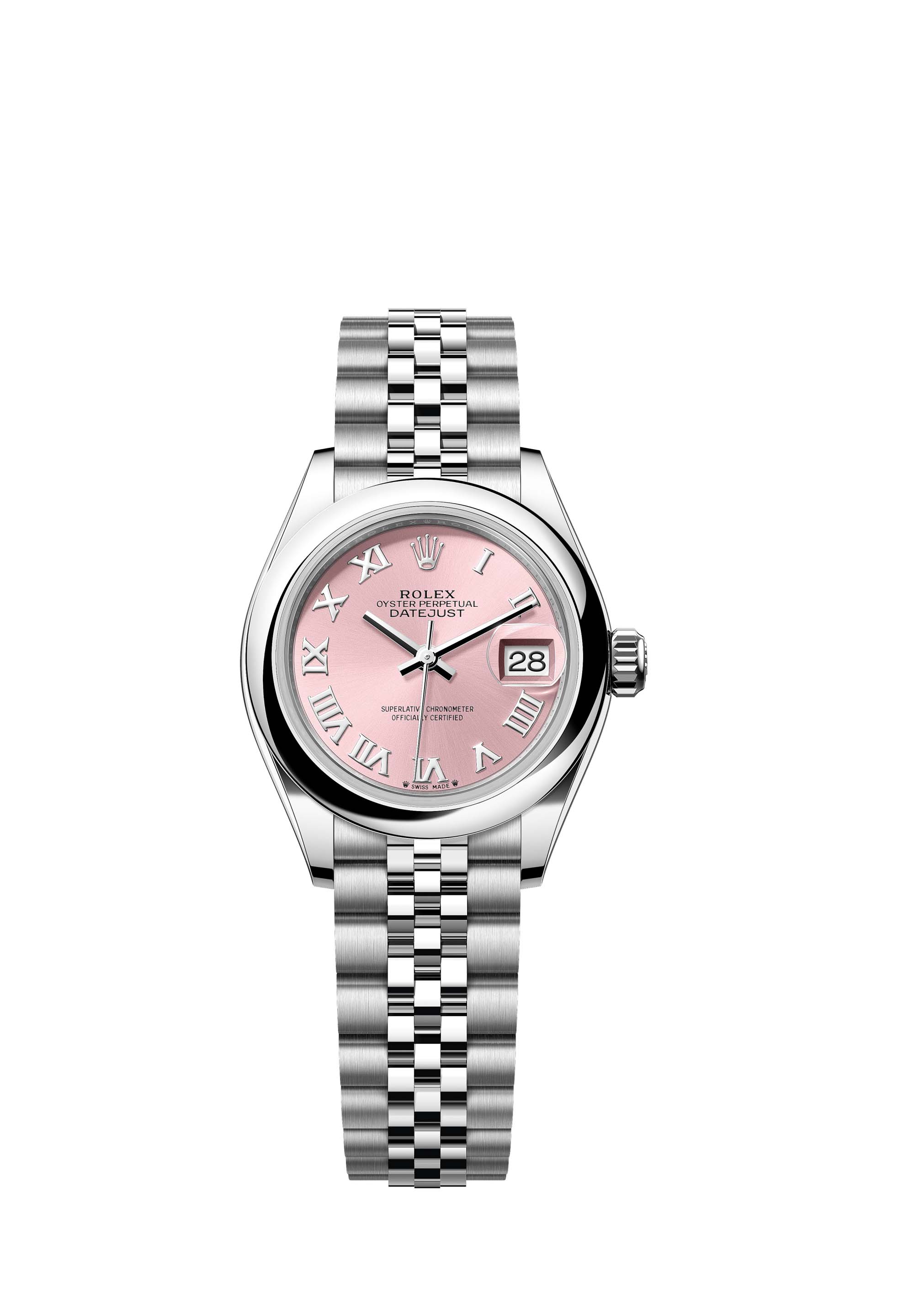 This Oyster Perpetual Lady-Datejust in Oystersteel features a pink dial and a Jubilee bracelet.