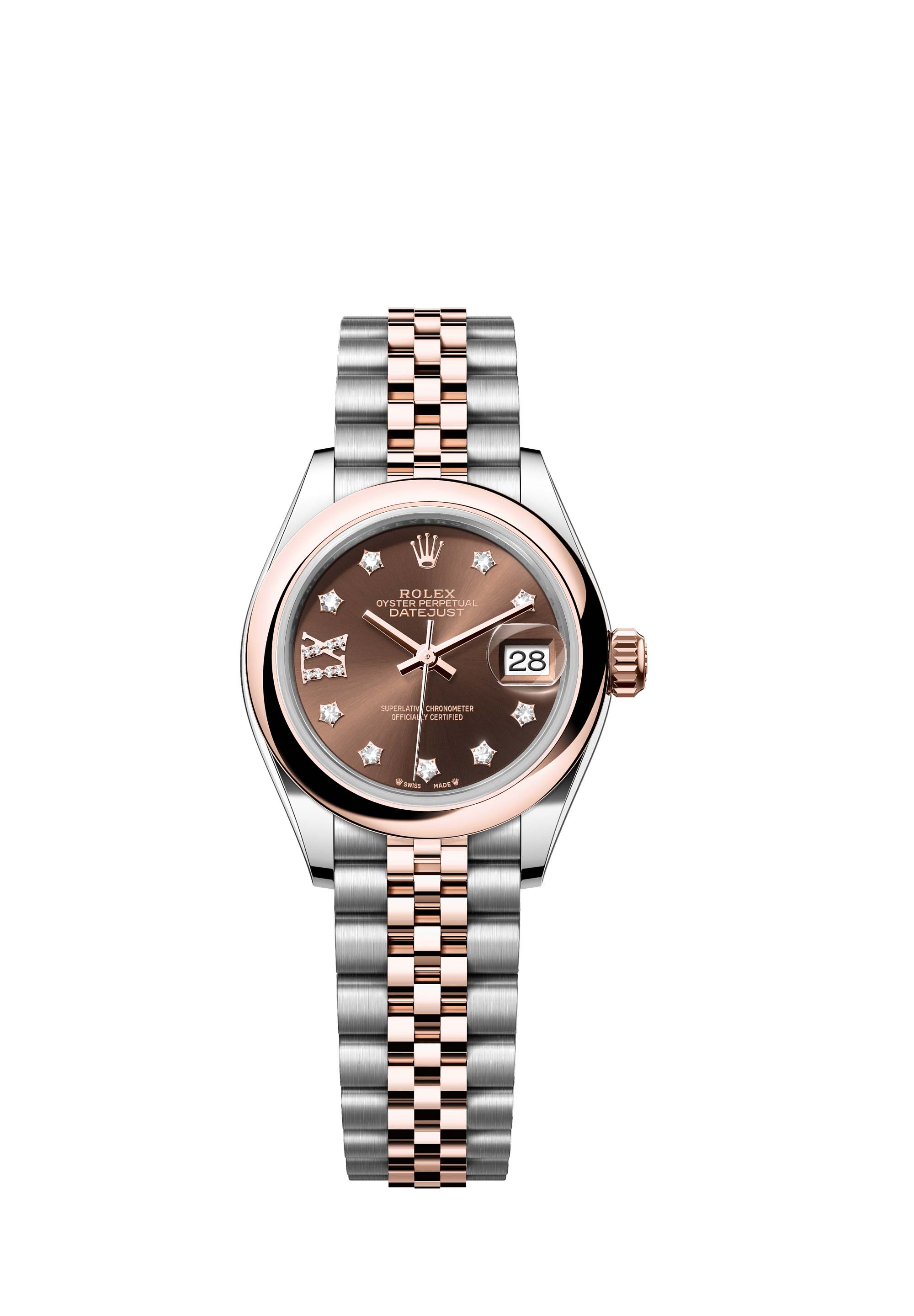 This Oyster Perpetual Lady-Datejust in Oystersteel and Everose gold features a chocolate, diamond-set dial and a Jubilee bracelet.