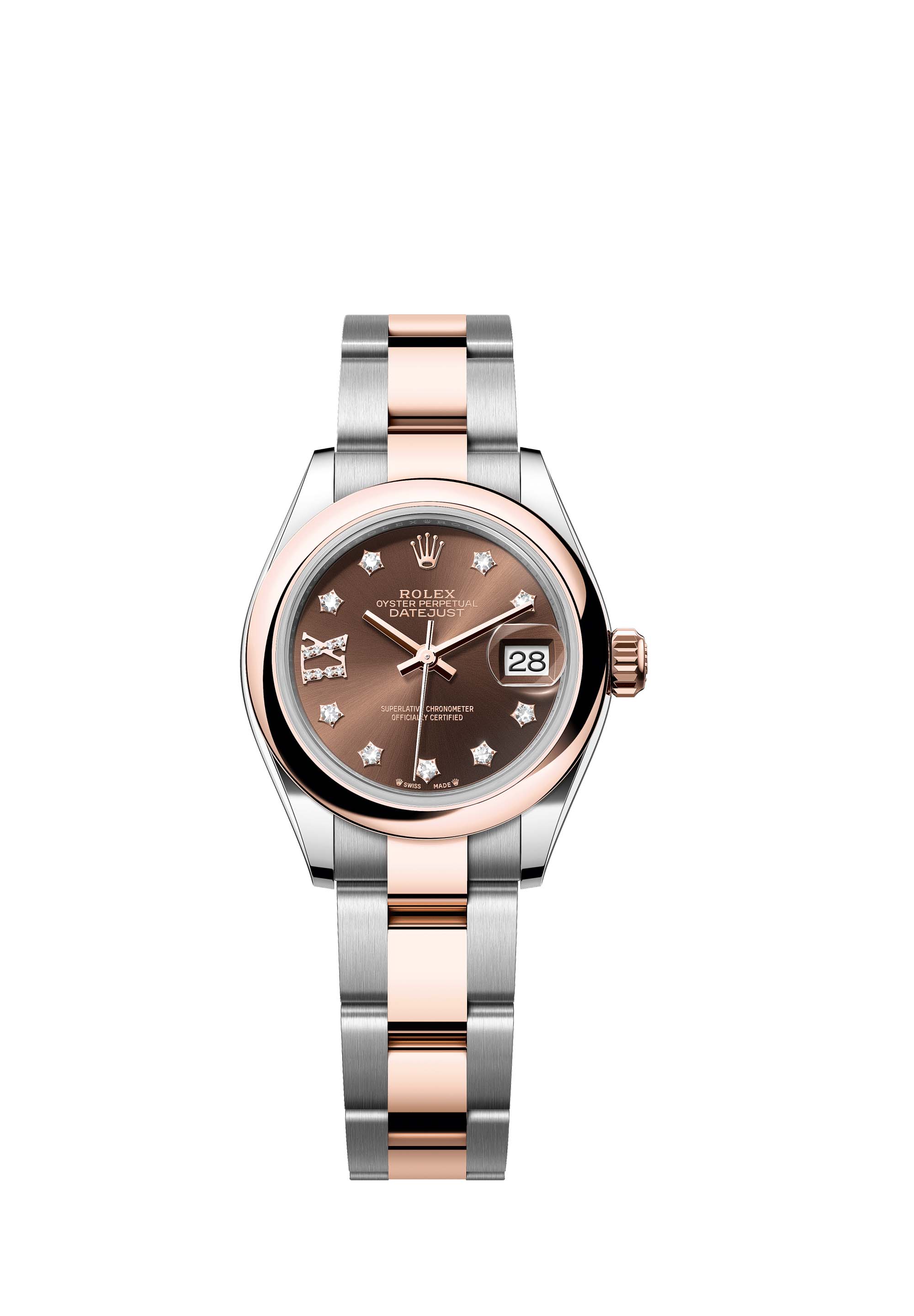 This Oyster Perpetual Lady-Datejust in Oystersteel and Everose gold features a chocolate, diamond-set dial and an Oyster bracelet.
