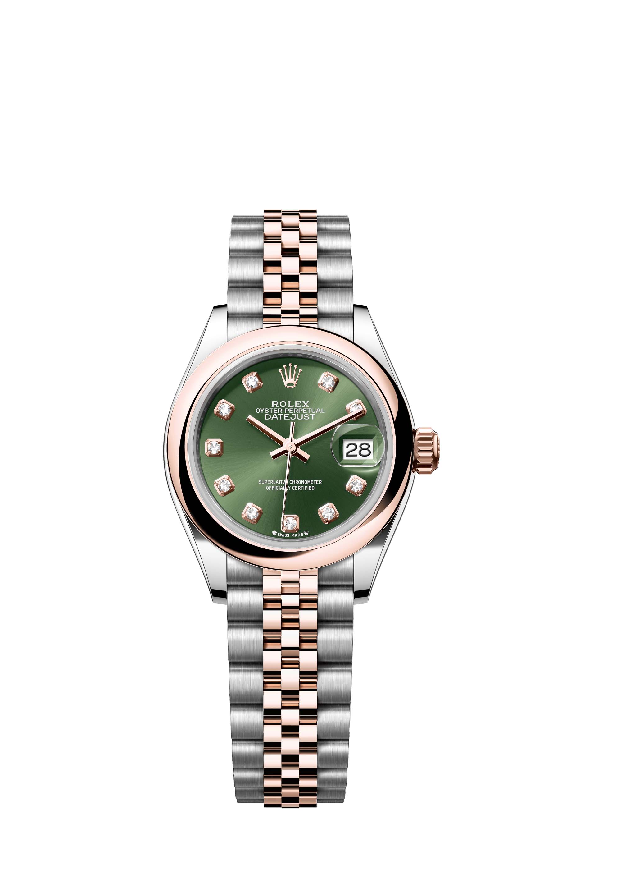 This Oyster Perpetual Lady-Datejust in Oystersteel and Everose gold features an olive-green, diamond-set dial and a Jubilee bracelet.