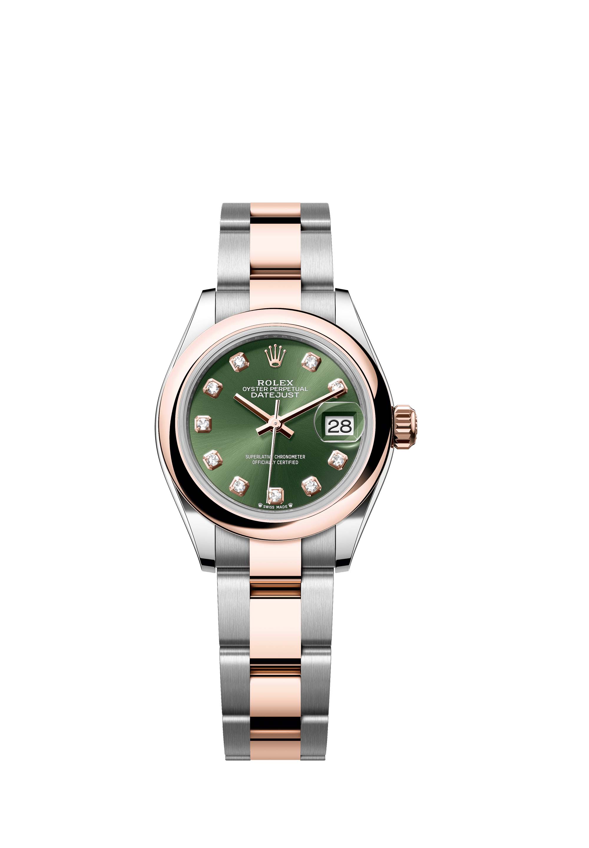 This Oyster Perpetual Lady-Datejust in Oystersteel and Everose gold features an olive-green, diamond-set dial and an Oyster bracelet.