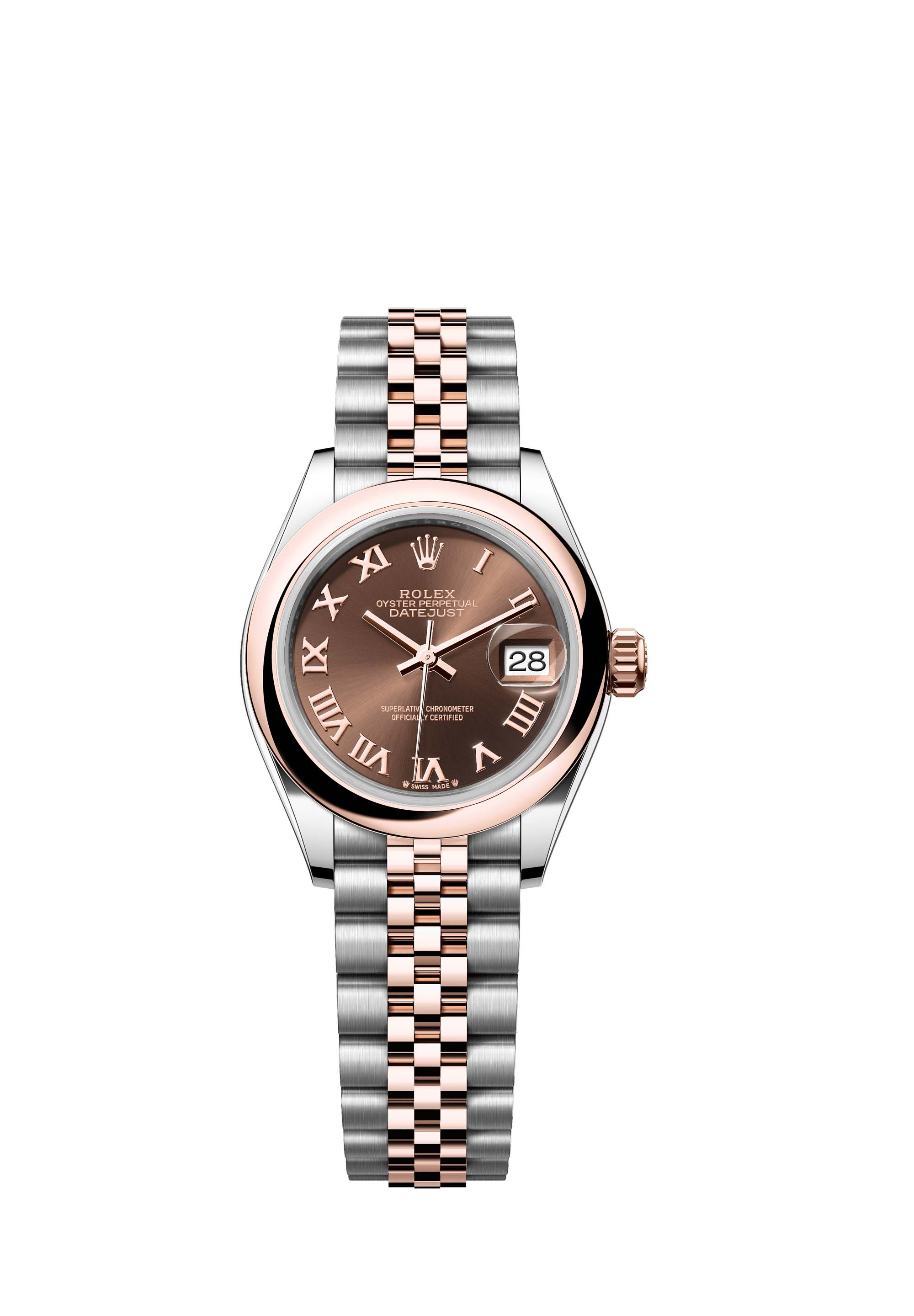 This Oyster Perpetual Lady-Datejust in Oystersteel and Everose gold features a chocolate dial and a Jubilee bracelet.