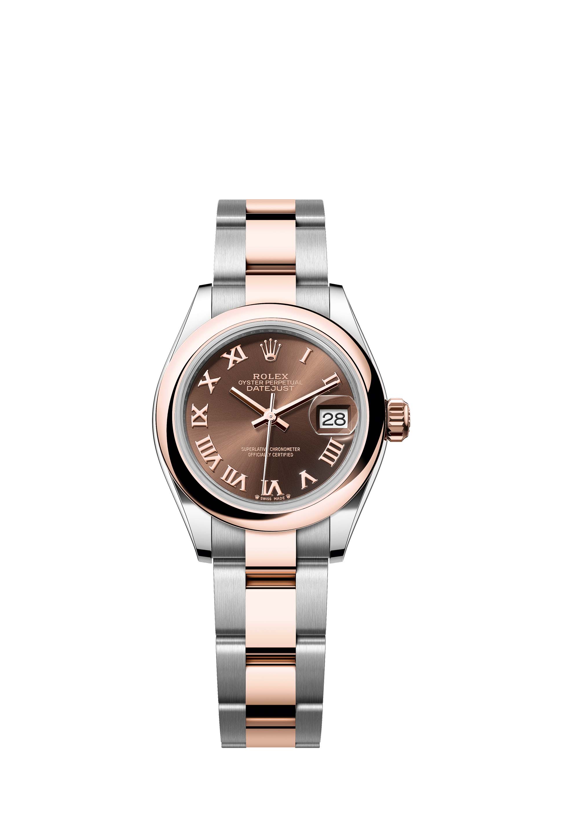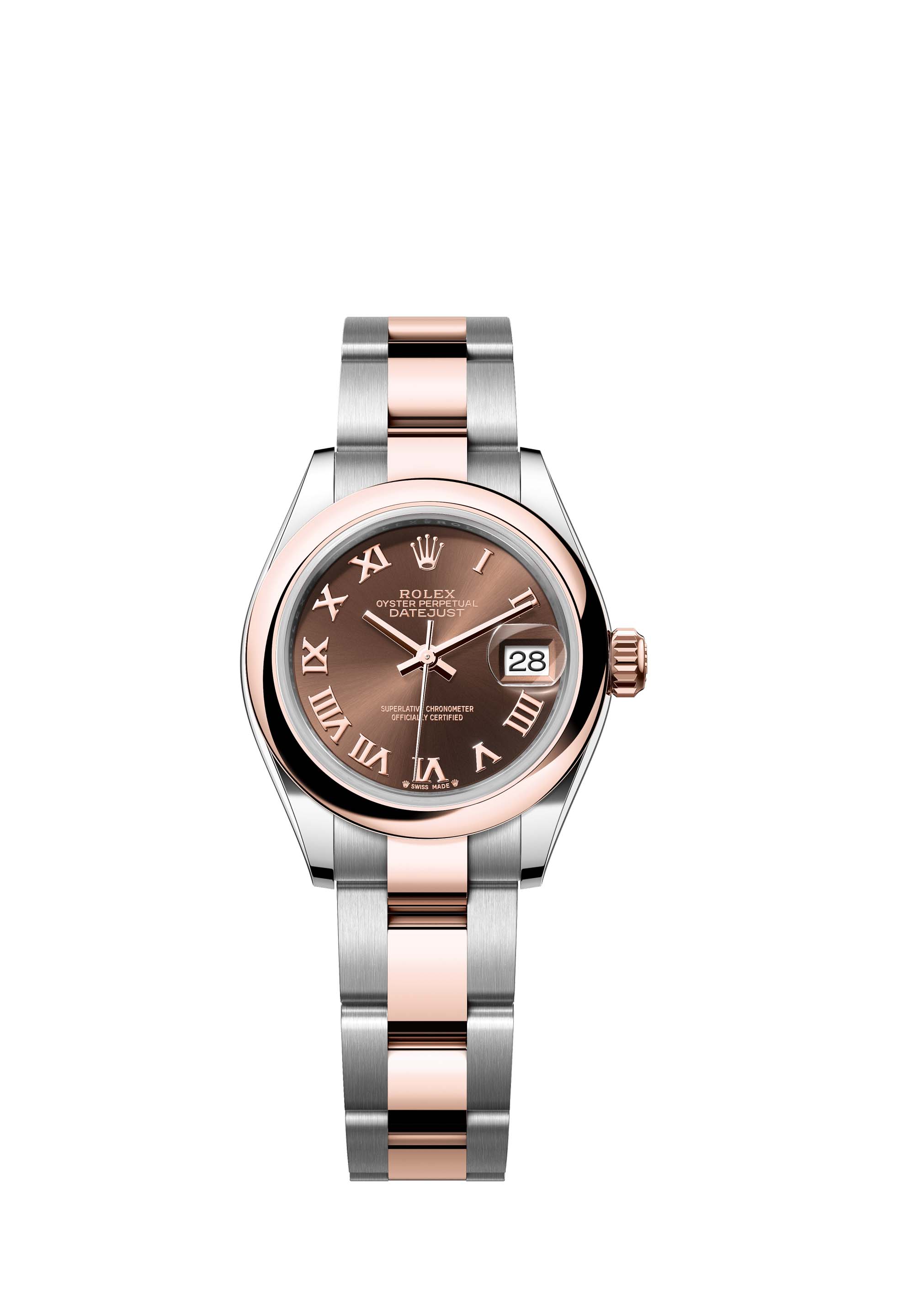 This Oyster Perpetual Lady-Datejust in Oystersteel and Everose gold features a chocolate dial and an Oyster bracelet.