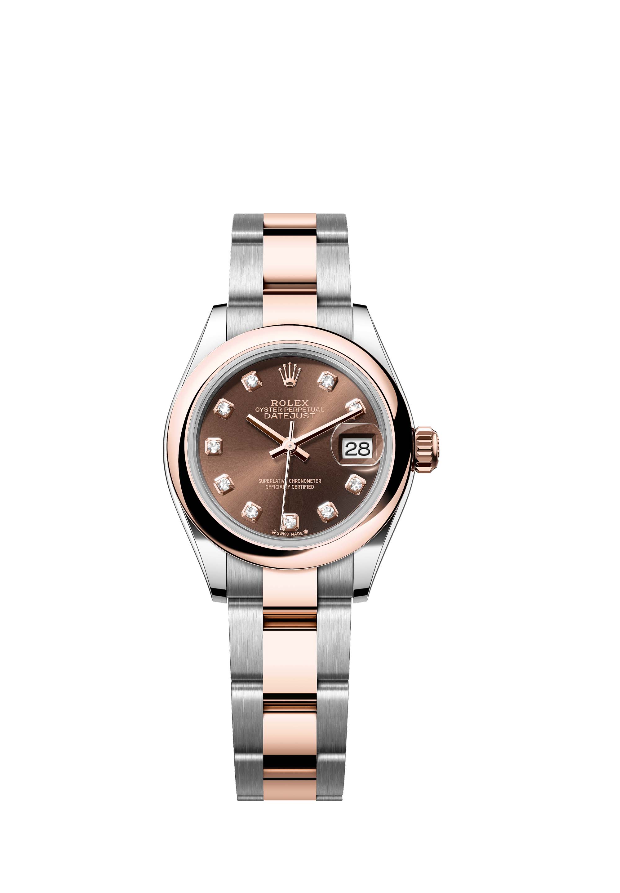 This Oyster Perpetual Lady-Datejust in Oystersteel and Everose gold features a chocolate, diamond-set dial and an Oyster bracelet.
