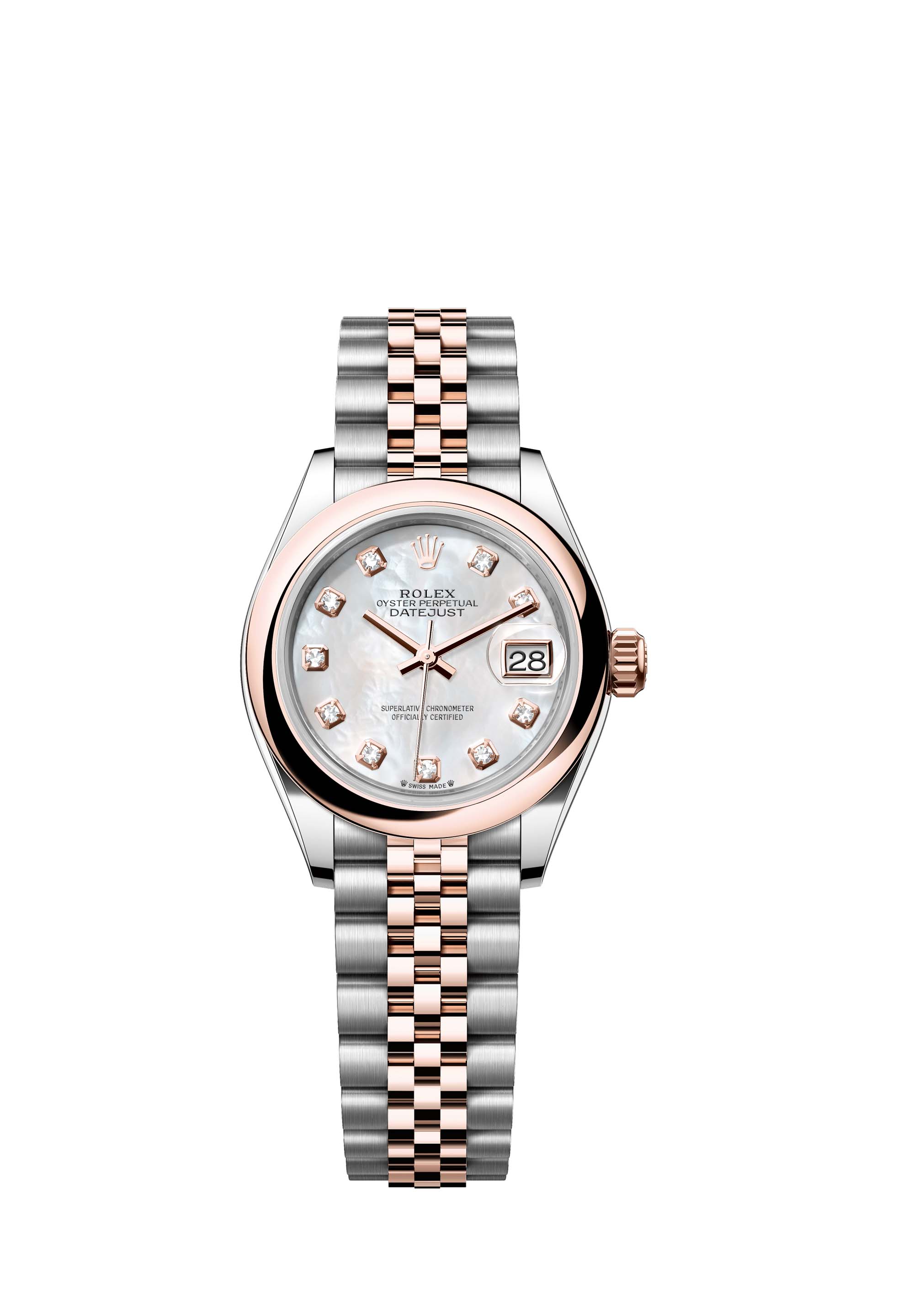 This Oyster Perpetual Lady-Datejust in Oystersteel and Everose gold features a white mother-of-pearl, diamond-set dial and a Jubilee bracelet.