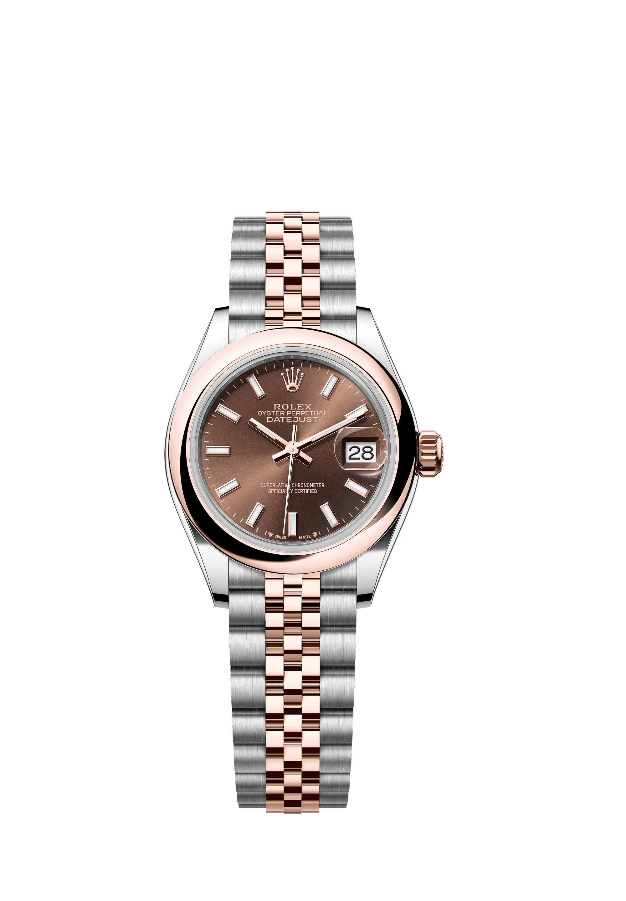 This Oyster Perpetual Lady-Datejust in Oystersteel and Everose gold features a chocolate dial and a Jubilee bracelet.