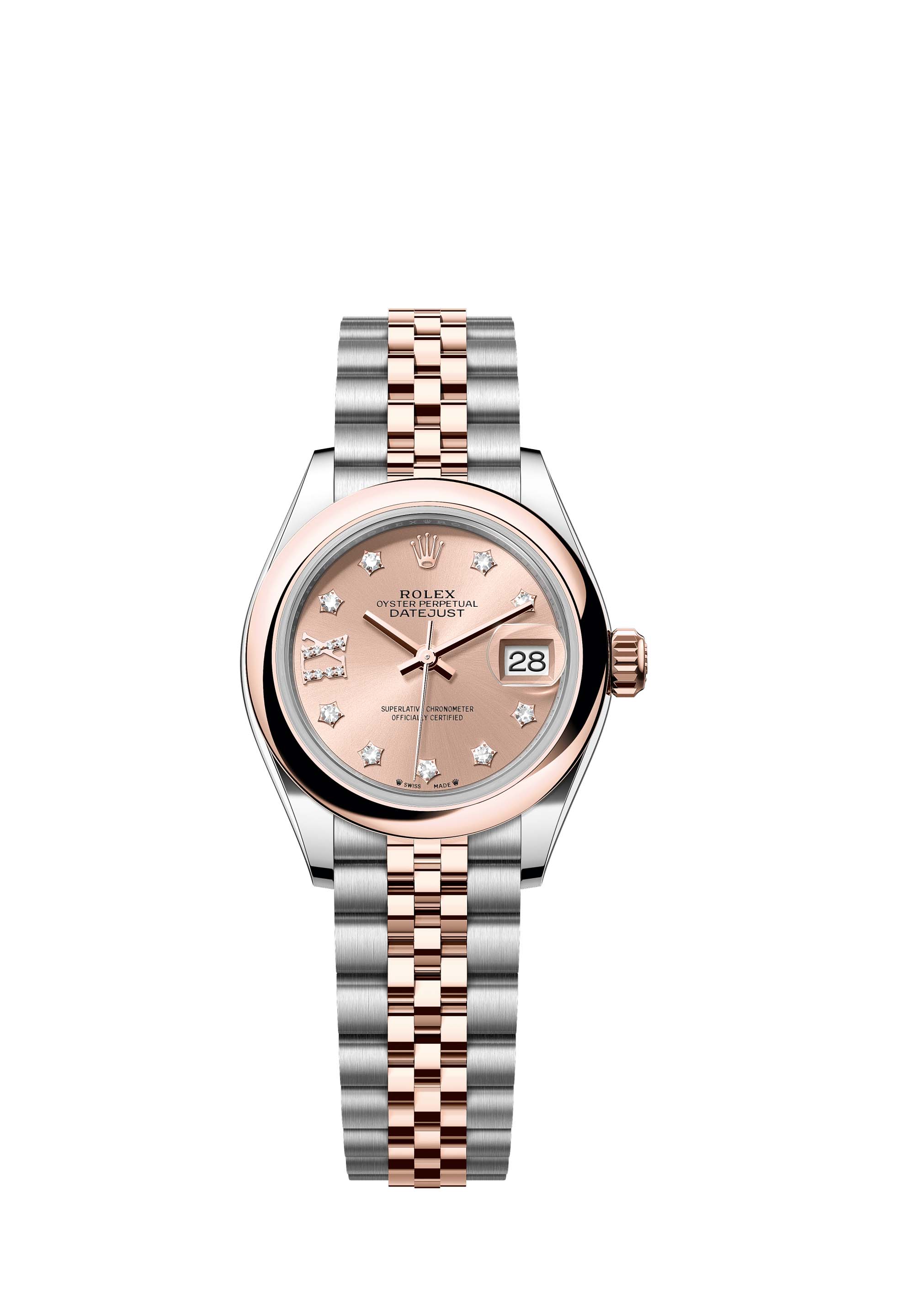This Oyster Perpetual Lady-Datejust in Oystersteel and Everose gold features a rosé colour, diamond-set dial and a Jubilee bracelet.